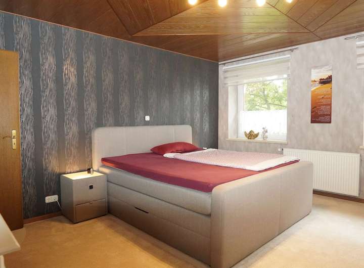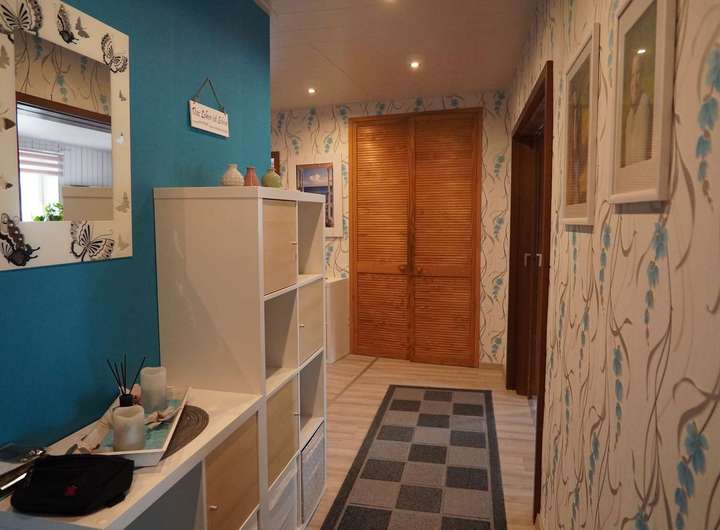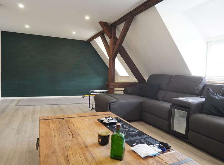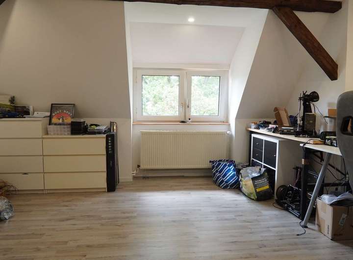 Im Anschluss öffnet sich das Wohnzimmer mit sichtbaren Balken, die der Wohnung ein besonderes Flair verleihen. Weitere Räume sind ein Kinder- oder Arbeitszimmer, ein Schlafzimmer sowie eine Küche mit einer modernen Küchenzeile.