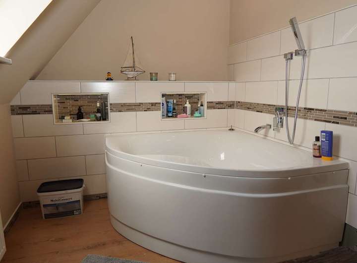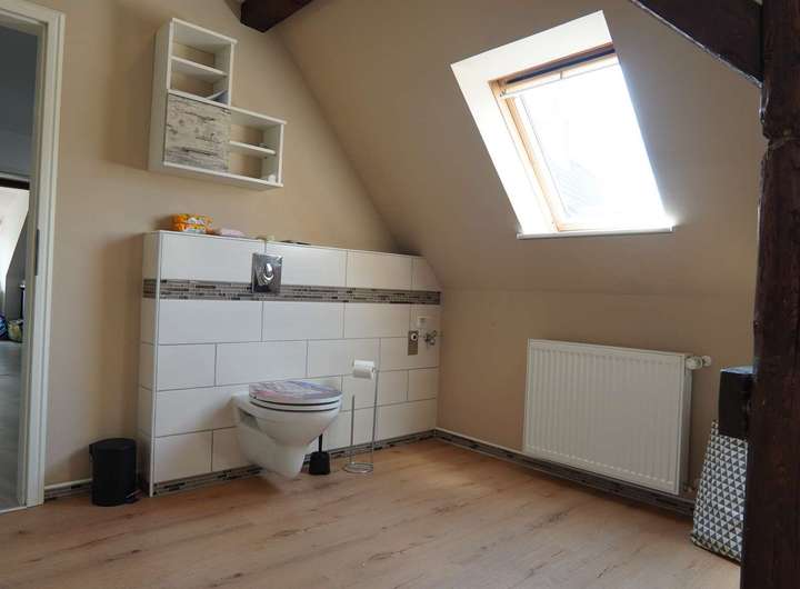 Der weiterführende Treppenaufgang führt zu der ebenso liebevoll errichteten Dachgeschosswohnung. Hier handelt es sich um eine charmante 3-Zimmer-Wohnung, deren großzügige Diele den Zugang zu allen Räumen ermöglicht. Linksläufig befindet sich das Wannenbad, ergänzt durch eine moderne Dusche, die aktuell fertiggestellt wird. Auch hier ist befindet sich ein Fenster zur optimalen Belüftung und Lichtzufuhr.