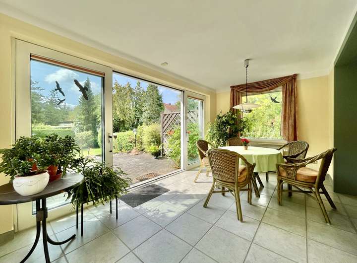 Die Wohnung im Erdgeschoss empfängt Sie mit einem weitläufigen Flur. Von hier aus gelangen Sie in das helle Esszimmer, das durch Schiebetüren mit dem angrenzenden Wohnzimmer verbunden ist – ein Ort, der zu geselligen Abenden einlädt. Die geräumige Küche ist bereits mit einer Einbauküche samt Mittelinsel und Induktionskochfeld ausgestattet und bietet direkten Zugang zur gemütlichen Veranda. Von hier genießen Sie einen herrlichen Blick in den liebevoll angelegten Garten sowie auf die vorgelagerte, ca. 24 m² große Terrasse mit elektrischer Markise – perfekt für entspannte Stunden im Freien. Ein weiteres großzügiges Zimmer sowie ein tagesbelichtetes, gefliestes Duschbad runden diese Ebene ab.