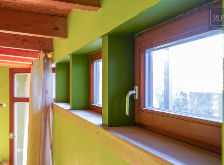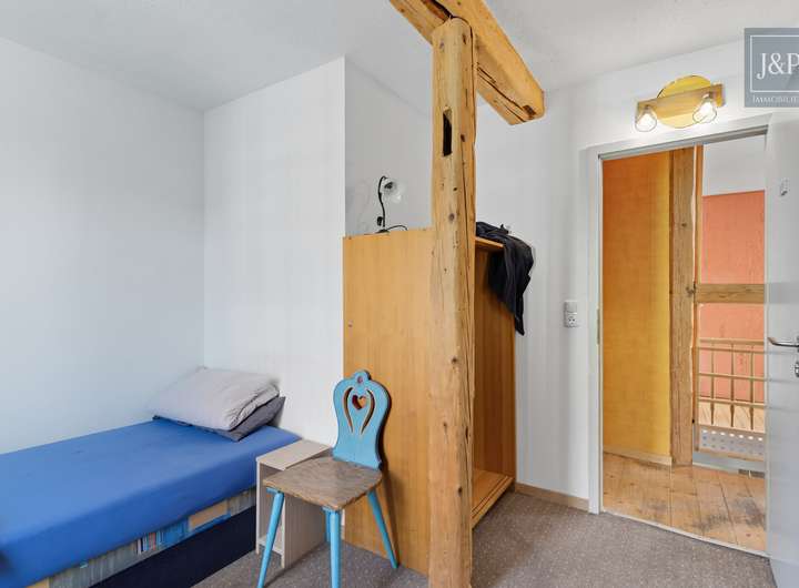 Der Massivholz-Anbau aus den 2000er verfügt im Obergeschoss über eine helle Galerie mit offener Blickverbindung in den Anbaubereich; derzeit besteht hier keine feste Treppenverbindung in das untere Anbauteil (die Blickbeziehung/Öffnung ist vorhanden). Im Erdgeschoss des Anbaus liegt die eigenständige Einliegerwohnung mit separatem Eingang: Sie umfasst einen Eingangsflur, eine Küche, ein Wohnzimmer, ein Schlafzimmer und ein Bad und ist somit unmittelbar nutzbar.