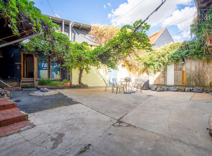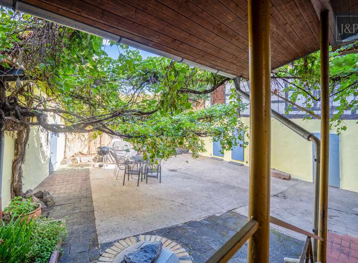 Das Hauptgebäude ist L-förmig angelegt und öffnet sich zu einem privaten Innenhof, der genug Stellflächen für drei PKWs bietet. Der Hof ist von den Gebäuden umschlossen und schafft diskrete Privatsphäre; ein alter Weinstock und ein Brunnen prägen den Innenhofcharakter. Von der Hofzufahrt erreichen Sie das Nebengebäude, das über einen eigenen Stromanschluss verfügt und vielfältig nutzbar ist.