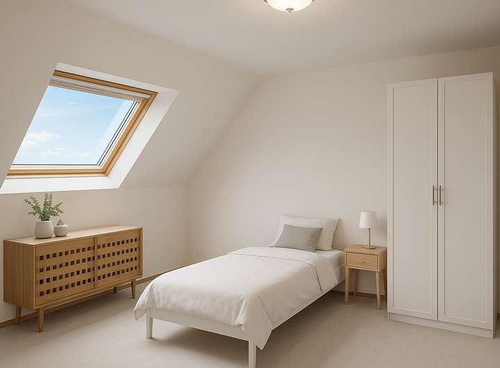 Im Dachgeschoss wartet ein komplett ausgebautes Studio – ein Raum für Atelier, Homeoffice oder Jugendzimmer. Das Dachflächenfenster mit elektrisch bedienbarem Rollladen bringt Komfort und Licht zugleich. Ein zusätzlicher Speicherraum bietet wertvollen Stauraum.
