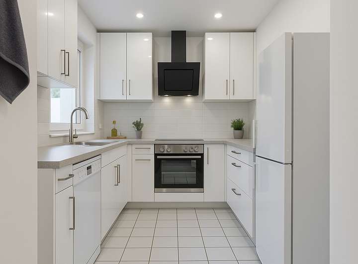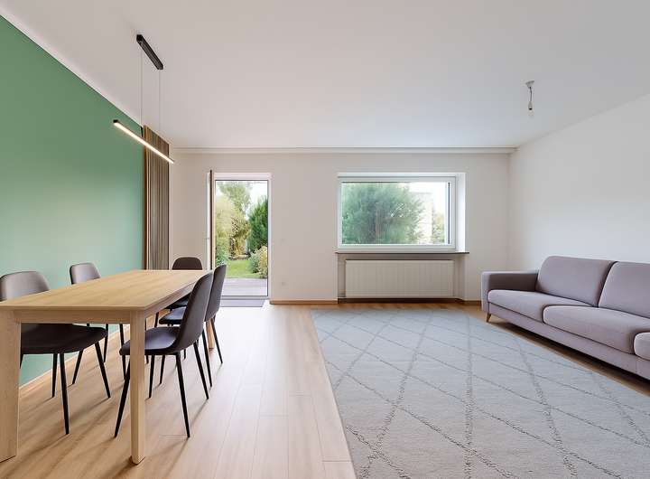Im Erdgeschoss öffnet sich der großzügige Wohn- und Essbereich, hell durchflutet von Tageslicht, das durch die großen Fenster einfällt. Hier spielt sich das Leben ab – ob gemütliches Beisammensein mit der Familie, festliche Abende mit Gästen oder einfach ein ruhiger Feierabend auf der Couch. Die Küche liegt praktisch gleich daneben und lädt ein, kulinarische Momente zu gestalten. Ein Gäste-WC ergänzt das Erdgeschoss sinnvoll.