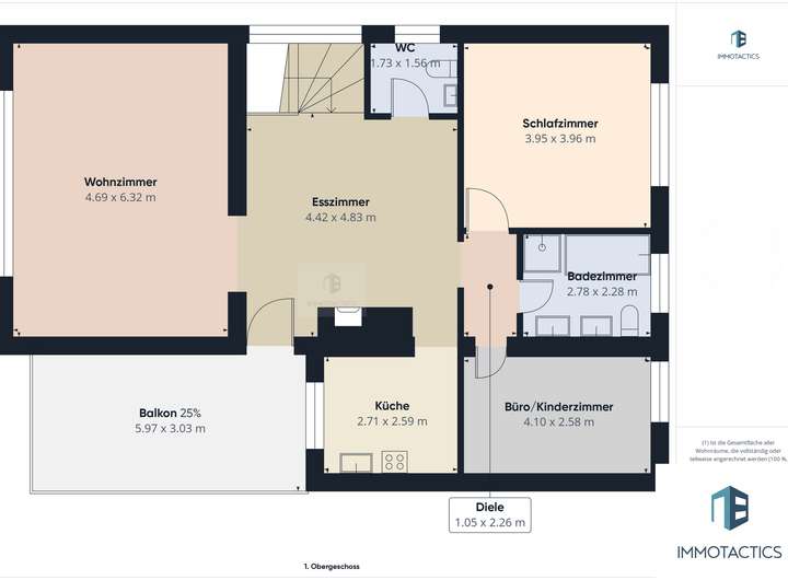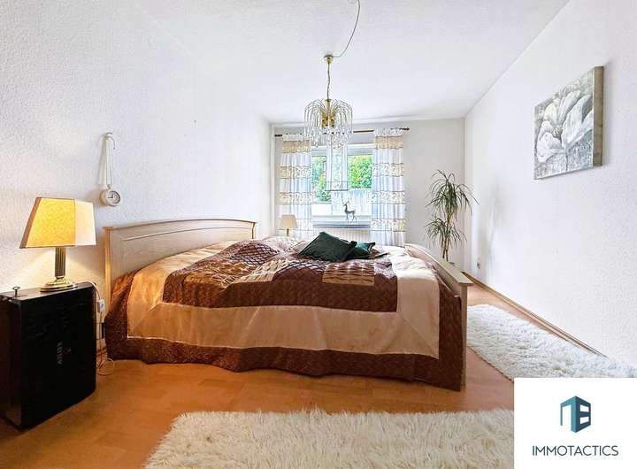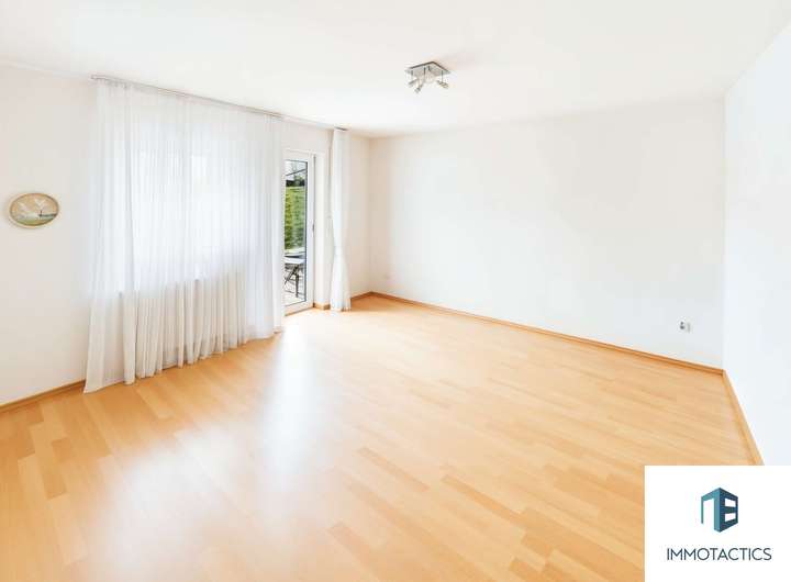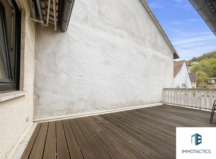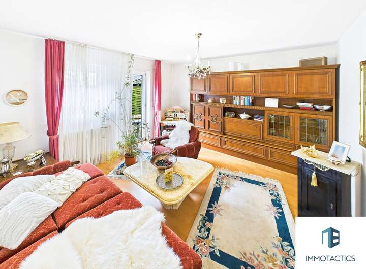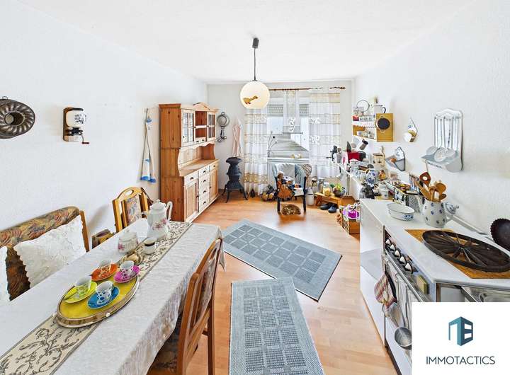 Das Obergeschoß der Immobilie zeigt das volle Potenzial, das in ihr steckt: Das großzügige Wohnzimmer mit einer Fläche von rund 30 m² bildet zusammen mit der offenen Verbindung zum Esszimmer den Mittelpunkt der Etage. Hier entsteht eine harmonische Verbindung aus Wohnen, Essen und Leben – ideal für den Alltag mit Kindern oder gesellige Abende mit Freunden. Die direkt angrenzende Küche gewährleistet kurze Wege und Effizienz im Tagesablauf. Vom Esszimmer aus gelangen Sie auf den weitläufigen Balkon, der sich ideal für entspannte Sonnenstunden am Nachmittag und Abend eignet.