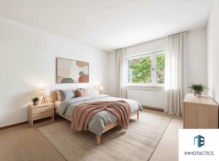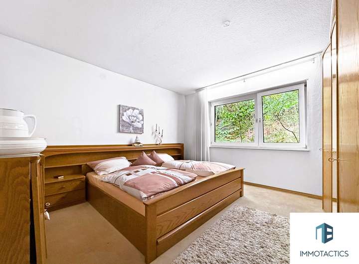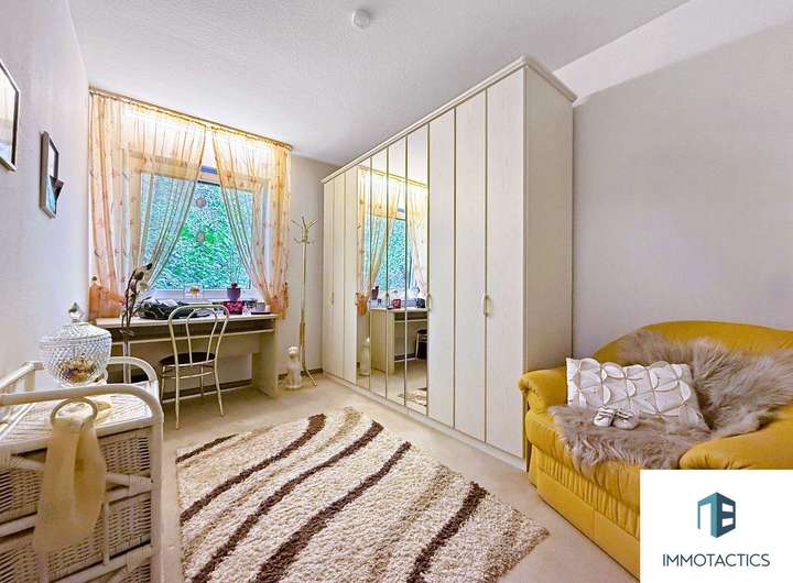 Das Schlafzimmer im Obergeschoss überzeugt durch seine ruhige Lage mit Blickrichtung zum Garten und das angrenzende Badezimmer. Dieses ist sowohl mit einer Badewanne als auch einer Dusche ausgestattet und wird durch ein Fenster natürlich belichtet. Die Etage wird durch ein weiteres Zimmer ergänzt, das sich hervorragend als Kinderzimmer oder Büro eignet. Dies ist ein Vorteil für alle, die hybrid arbeiten oder ein kreatives Arbeitsumfeld zu Hause suchen. Ein zusätzliches Gäste-WC im Obergeschoss bietet Flexibilität, insbesondere bei Besuch oder im Familienalltag.