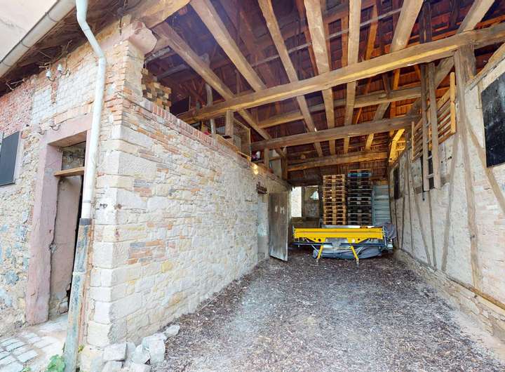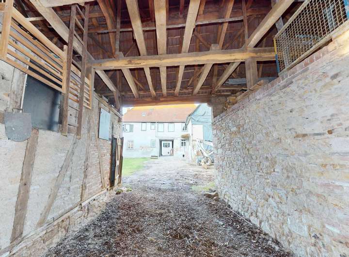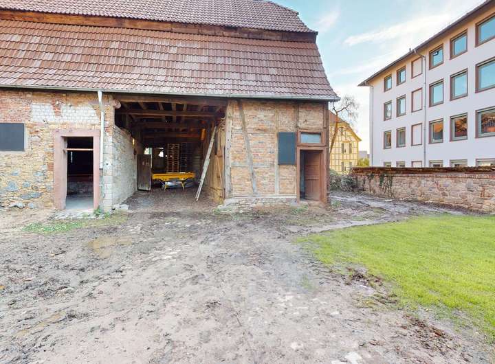 Die bestehende Scheune mit einer Grundfläche von ca. 150 m² und rund 10 Metern Höhe bietet zusätzliche Gestaltungsoptionen für ein charaktervolles Bauprojekt.