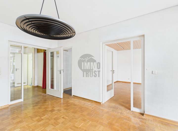 Auf einer Wohnfläche von ca. 120 m² offenbart sich ein gut durchdachter Grundriss, der viel Platz für Ihre individuellen Gestaltungsmöglichkeiten bietet. Mit insgesamt vier Zimmern, darunter drei geräumige Schlafzimmer, eignet sich dieses Objekt hervorragend für Familien oder Paare. Das großzügige Wohnzimmer beeindruckt mit einem gut erhaltenen Echt-Holz-Parkett, das eine einladende Atmosphäre schafft.