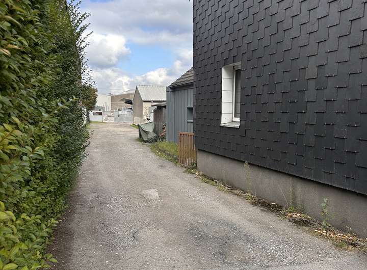 Durch die Einfahrt der linken Seite erreicht man den Seiteneingang. Hier befindet sich eine Wohneinheit auf zwei Ebenen mit kleinem Garten.