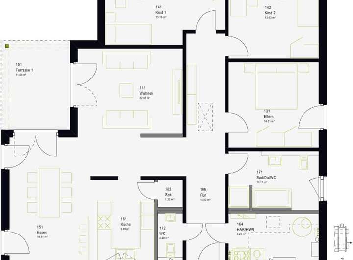 Willkommen in einem Zuhause, das mehr ist als nur ein Dach über dem Kopf – hier wird Wohnen zum echten Lebensgefühl. Dieses moderne Eigenheim verbindet zeitlose Eleganz mit einem innovativen Grundriss, der dir maximale Flexibilität und Individualität schenkt. Die verwinkelte Architektur erzählt eine Geschichte von Persönlichkeit und Stil, während klare Linien Ruhe und Geborgenheit schaffen. Das elegante Walmdach mit überdachter Terrasse bietet dir einen geschützten Rückzugsort – perfekt für entspannte Abende im Garten, gesellige Momente mit Freunden oder einfach zum Durchatmen. Auf einer Ebene erwarten dich ca. 147 m² Wohnfläche voller Licht und Freiraum. Das Herzstück bildet das offene, lichtdurchflutete Esszimmer mit moderner Küche – ein Ort für gemeinsames Kochen, Lachen und unvergessliche Augenblicke. Deine Highlights im Überblick: Ca. 147 m² auf einer Ebene – perfekt für Familien, Paare oder alle, die das Besondere suchen Verwinkelte Architektur & innovative Raumgestaltung für individuelle Wohnkonzepte Überdachte Terrasse mit Walmdach – dein privater Rückzugsort im Grünen Zwei Kinderzimmer, behagliches Elternschlafzimmer, Familienbad, Gäste-WC & Hauswirtschaftsraum Helle, offene Räume mit erhöhter Raumhöhe für ein einzigartiges Wohngefühl Nachhaltiges Bauen für mehr Umweltbewusstsein und Zukunftssicherheit Dieses Eigenheim verbindet Familienleben und private Rückzugsorte auf harmonische Weise. Es ist nachhaltig gebaut, mit Liebe zum Detail gestaltet und vereint Stil, Komfort und Verantwortung. 👉 Hier entsteht nicht nur ein Haus – hier entsteht dein neues Leben voller Freude, Geborgenheit und Inspiration.