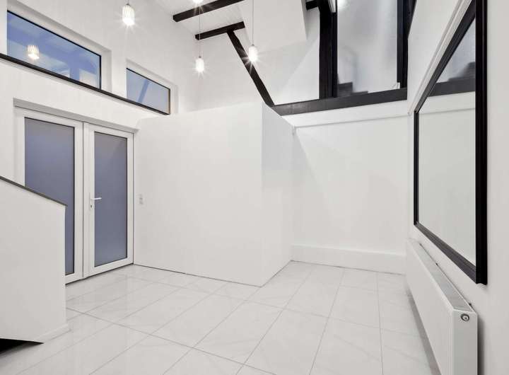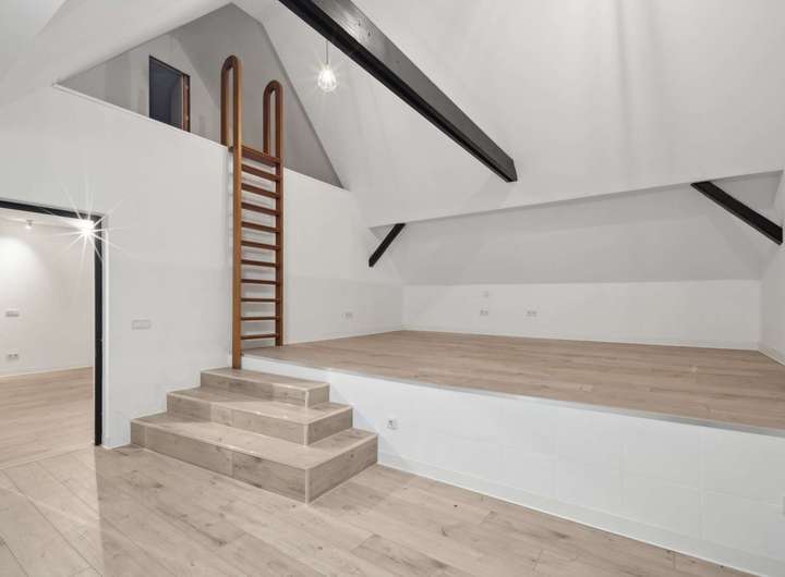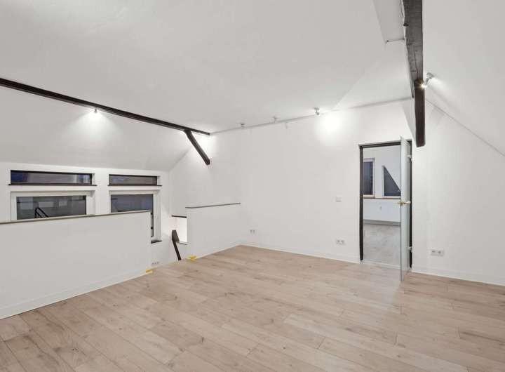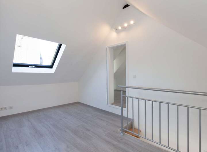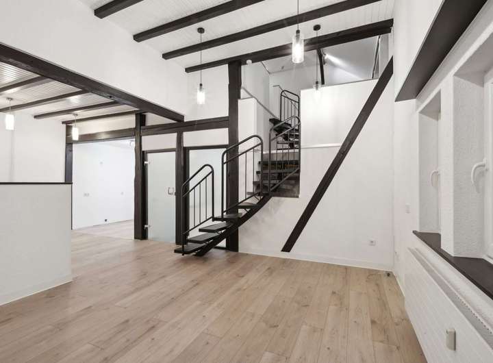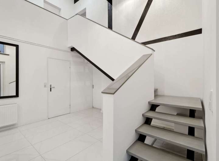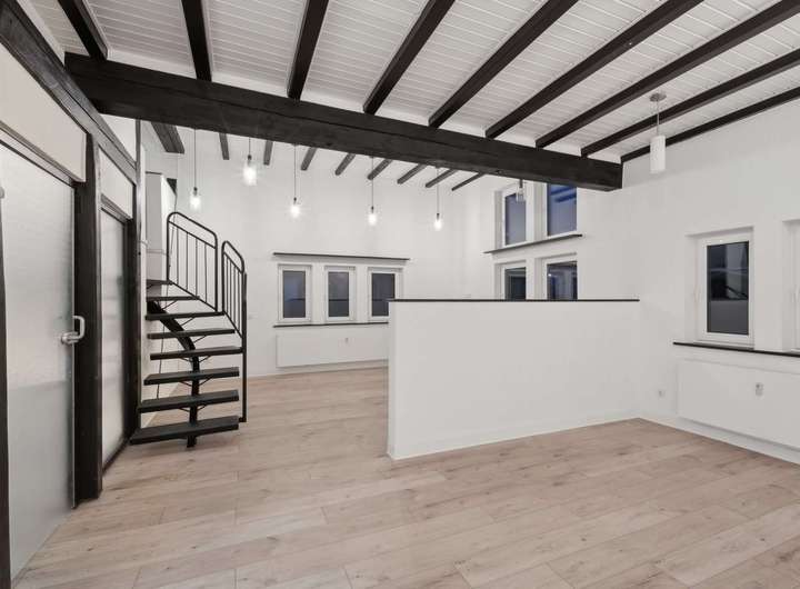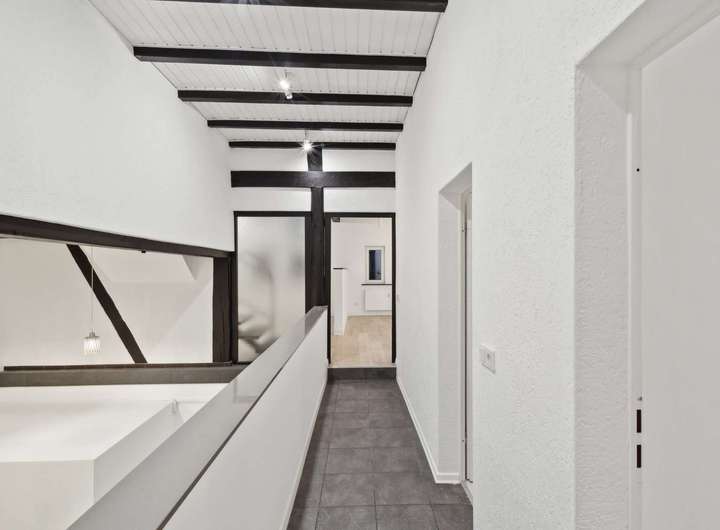 Im 1. Obergeschoss stehen Ihnen: Der Galerie/Flurbereich, ein Gäste-WC, ein Hauswirtschaftsraum mit WM-Anschluss, ein separates Zimmer mit einem abgeteilten Bereich, der z.B. als Ankleidezimmer genutzt werden könnte und als Highligt, der großzügige offene Wohn-/Ess-/Küchenbereich zur Verfügung. Hier bieten sich die verschiedensten Nutzungsmöglichkeiten an. Über die offene Holztreppe erreichen Sie eine Zwischenetage zum 2. Obergeschoss und von dort weiter zur großzügigen Galerie. Beide Ebenen bieten ausreichend Platz für Wohnnutzungs- und Gestaltungsmöglichkeiten. Ein separates riesiges Schlafzimmer über zwei Ebenen, ein modernes Bad mit Wanne, WC, Waschbecken und Dusche sowie ein weiteres separates Zimmer runden diese Etage ab.