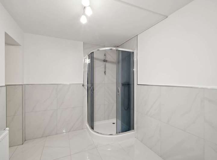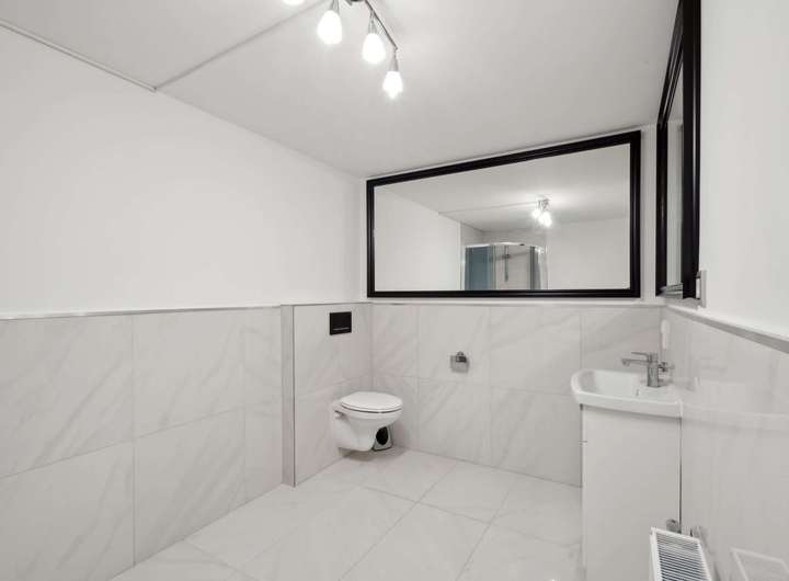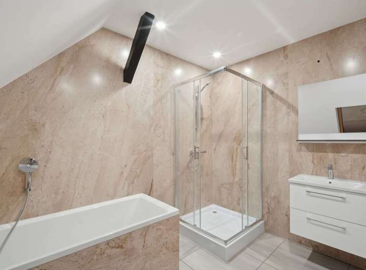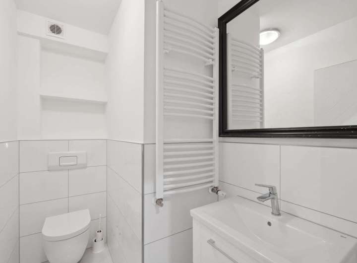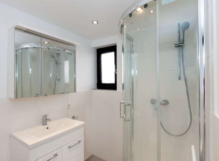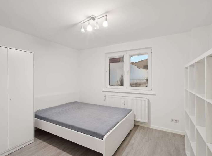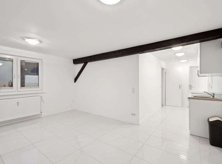Ebenso befindet sich, mit separatem Eingang, die schöne ELW mit ca. 48 m² Wohnfläche im Haupthaus. Die Wohnung teilt sich in einen offenen Wohn-/Essbereich mit EBK, ein separates Schlafzimmer und ein großes Bad mit Dusche, WC, Waschbecken und einem Anschluss für die Waschmaschine auf.