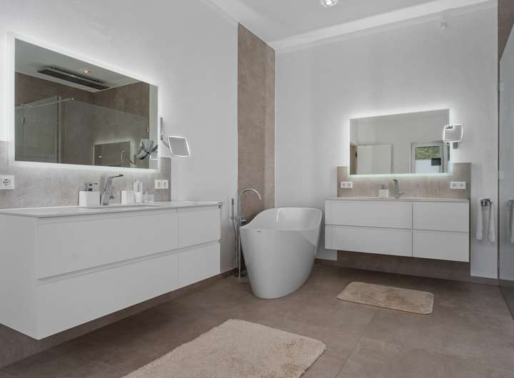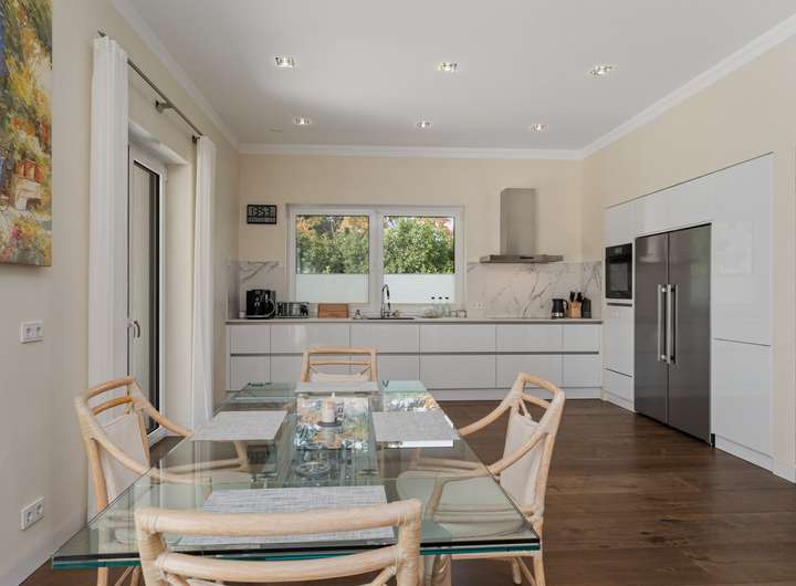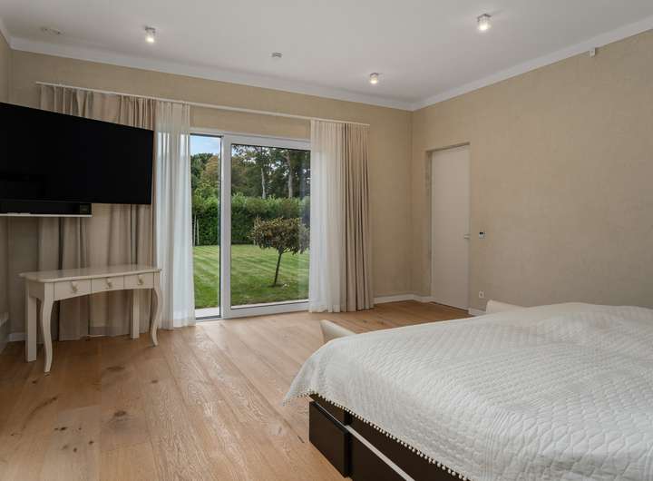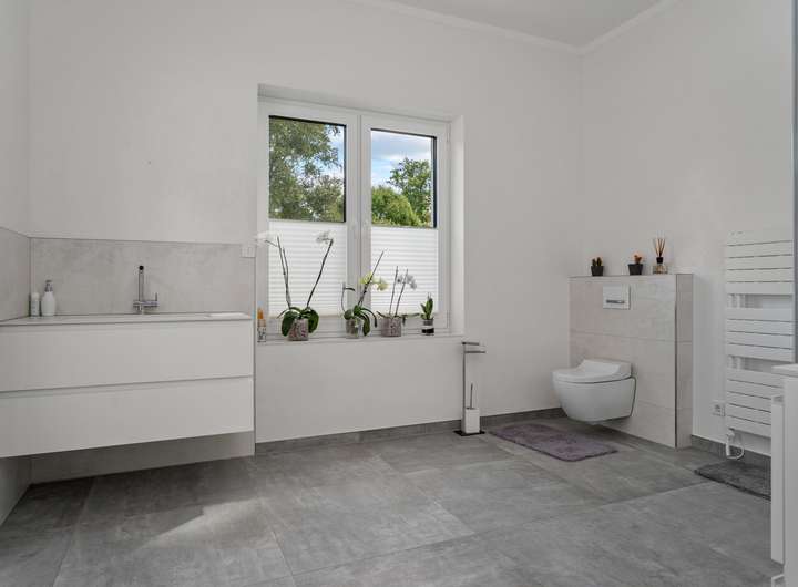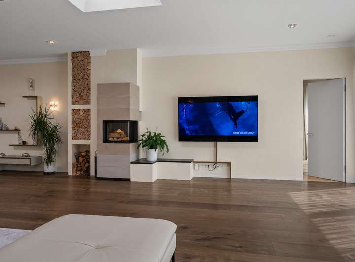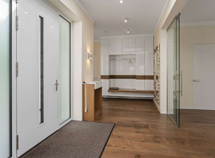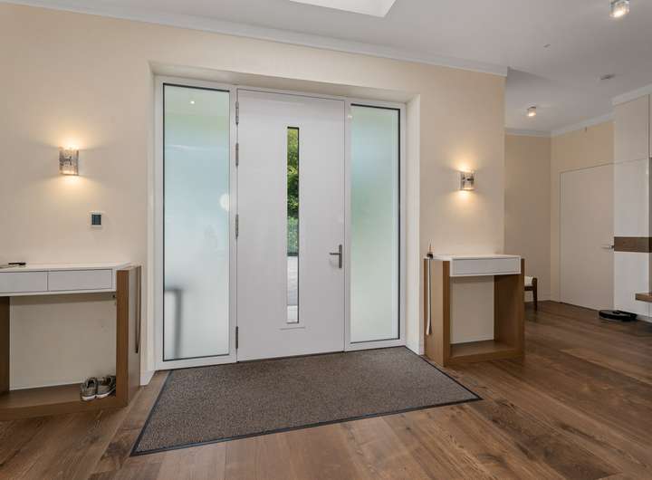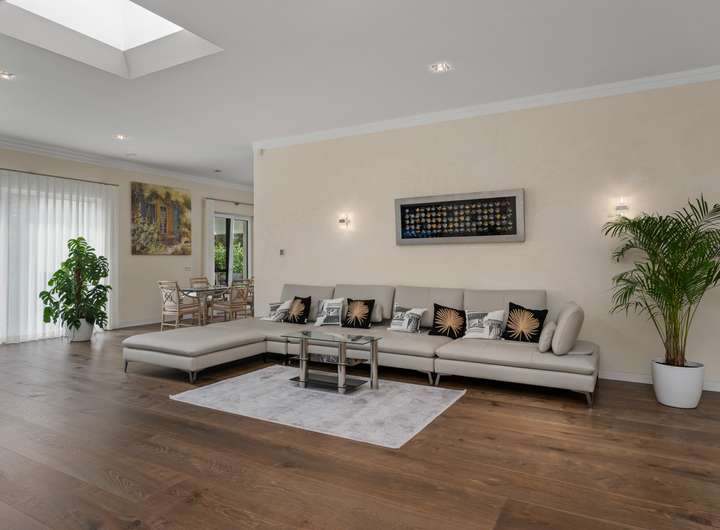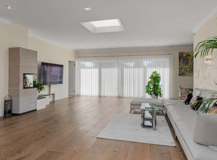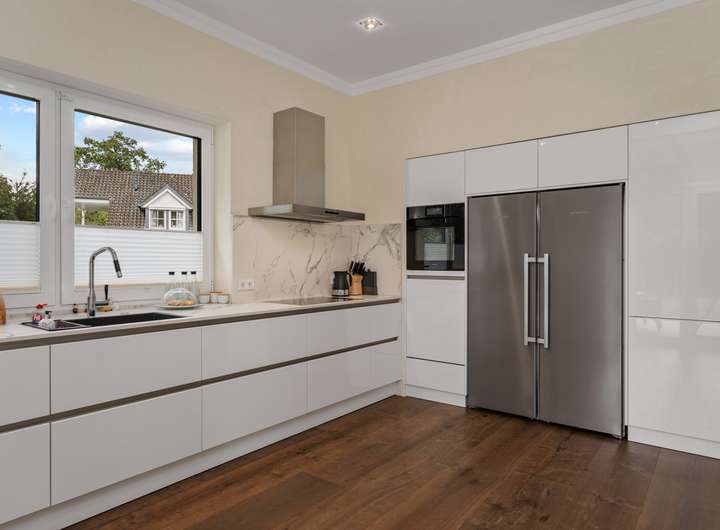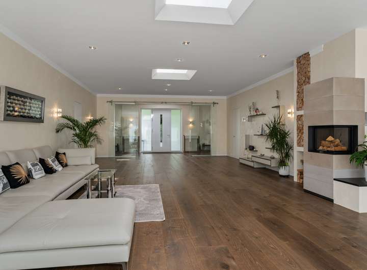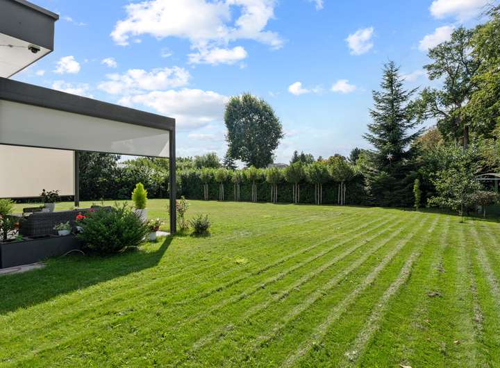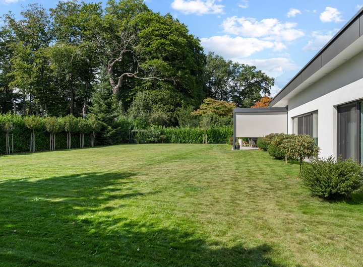+ Grundstücksfläche: 2.401m² + Baujahr: 2021 + Wohnfläche: 286,58m² + Deckenhöhe: 3,12m + Nutzfläche im Keller: 43,81m² + vier Wohn- und Schlafzimmer plus Ankleidezimmer + zwei Tageslichtbäder + KNX Smart Home + alle Fenster mit KNX-gesteuerten Jalousien + Videoüberwachung + Solaranlage + Wärmepumpe + Lüftungsanlage + Fußbodenheizung + Echtholzfußböden + maßgeschneiderte Innentüren aus Echtholz + drei Lichtkuppeln / Oberlichter + Wände mit atmungsaktiver Kalktechnik für gesundes Raumklima bearbeitet + Kamin im Wohnzimmer + halb offene Küche mit angeschlossenem Hauswirtschaftsraum + komplett ausgestattete Einbauküche + Hauswirtschaftsraum mit Waschmaschinenanschluss + Hauptschlafzimmer mit Bad en Suite + Hauptbad mit Wanne, bodengleicher Dusche und zwei Waschtischen + Ankleidezimmer dem Hauptbad direkt angeschlossen + Gästebad mit bodengleicher Dusche und zwei Waschtischen + maßgefertigte, deckenhohe Einbauschränke in Diele und Ankleide + überdachte Terrasse mit perfekter Südwestausrichtung + Doppelgarage mit angeschlossenem Werkstattraum (12,11m²) + Garten mit rund 1.000m² Rasenfläche und hohen Hecken + Bewässerungsanlage + GPS-gesteuerte Rasenmäher