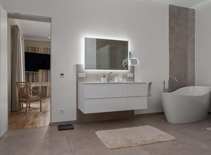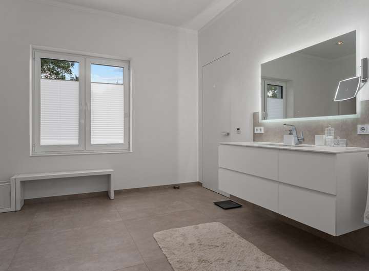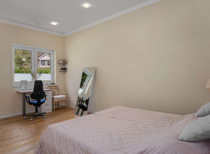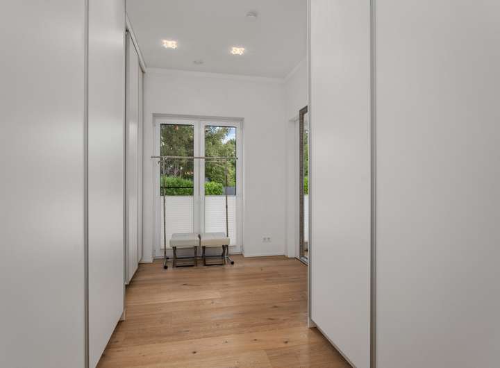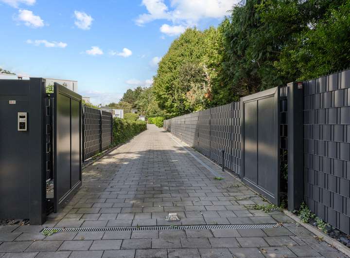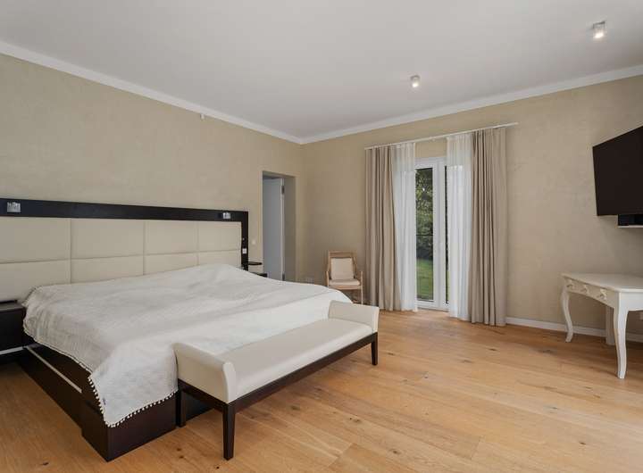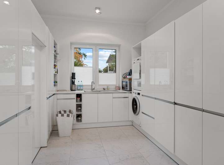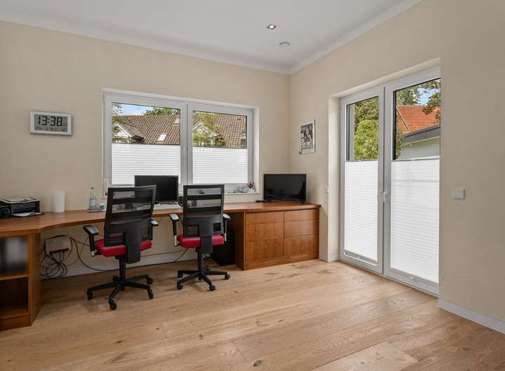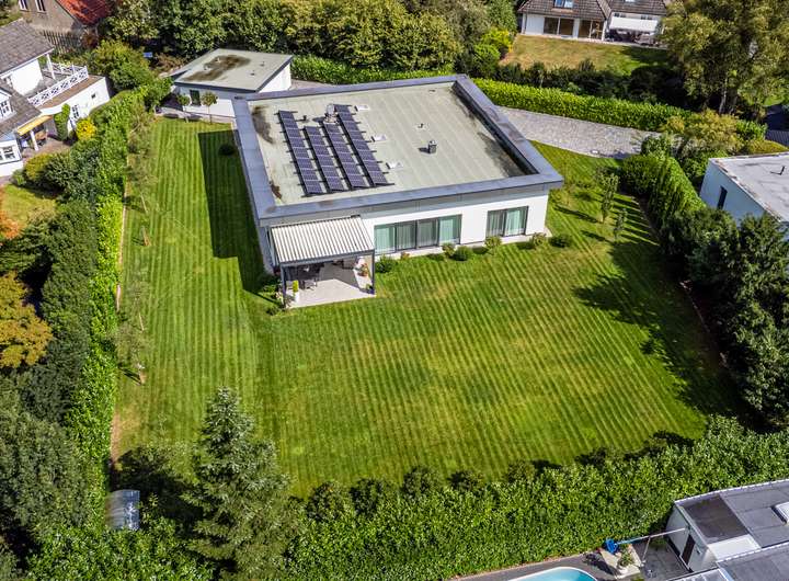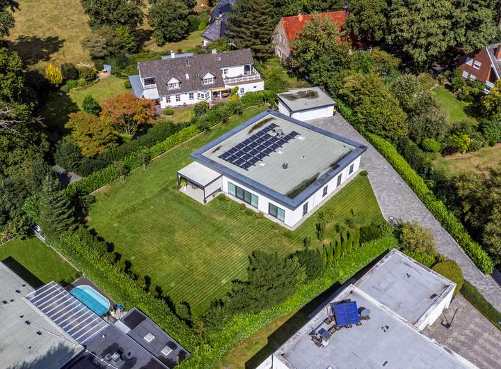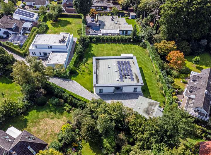 Der 2021 erbaute Bungalow bietet Ihnen mit 286,58m² Wohnfläche, die sich auf vier Wohn- und Schlafzimmer, separate Ankleide, offene Küche, zwei Tageslichtbäder und Hauswirtschaftsraum verteilen, enorm viel Platz, damit Sie sich hier ganz nach Ihren persönlichen Vorstellungen einrichten können. Und die Voraussetzungen sind hervorragend ... Der auf einem 2.401m² großen Grundstück befindliche Bungalow besticht durch sein äußerst stilvolles Design, seine großzügige Raumgestaltung, zu der auch die 3,12m hohen Decken beitragen, seine angenehme Helligkeit dank der bodentiefen Fenstertüren und drei Oberlichter sowie seine hochwertige Ausstattung und Einrichtung, zu der unter anderem die wunderschönen Echtholzparkettböden in allen Wohnbereichen, die moderne, komplett ausgestattete Einbauküche, die maßgefertigten Einbauschränke, der Kamin und die beiden schicken Tageslichtbäder zu zählen sind. Dank eines integrierten KNX-Systems, das neben der Heizung und der Beleuchtung auch die Außenjalousien an allen Fenstern steuert, kann man hier von einem echten Smart Home sprechen. Der videoüberwachte Außenbereich mit überdachter Terrasse in perfekter Südwestausrichtung, schön arrangierten Pflanzen, großer Rasenfläche zum Spielen und Flanieren, hohen Hecken als Sichtschutz sowie einem separaten Garagentrakt mit angeschlossener Werkstatt rundet das eindrucksvolle Gesamterscheinungsbild ab. Nach Betreten des Bungalows stehen Sie in einer geräumigen Eingangsdiele mit maßgefertigten, deckenhohen Einbauschränken im Garderobenbereich, die dank einer großen verglasten Trennwand mit Doppelschiebetür bereits den Blick in den Wohnbereich freigibt. Neben der Garderobe geht ein großes Tageslichtbad mit Dusche und zwei Waschtischen ab, das natürlich auch als Gäste-WC fungieren kann, zumal sich auf der gegenüberliegenden Seite der Diele ein Wohnraum befindet, der derzeit als Büro genutzt wird, aber durchaus auch als Gästezimmer dienen könnte. Durch die doppelflügelige Glasschiebetür gelangen Sie in den zentralen Wohnbereich mit Kamin, der Ihnen mit seinen fast 90m² Wohnfläche alle Möglichkeiten bietet, sich hier ganz nach Ihren individuellen Vorstellungen einzurichten. An der Stirnseite des Wohnzimmers schließt sich rechter Hand die offene Küche an, die mit einer modernen, top ausgestatteten Einbauküche mit weißen Hochglanzoberflächen eingerichtet ist. Von hier geht es auch direkt auf die überdachte Terrasse. Praktischerweise liegt gleich neben der Küche ein Hauswirtschaftsraum mit Waschmaschinenanschluss, der Ihnen enorm viel Stauraum bietet. Über eine Treppe erreichen Sie von hier den Keller, wo sich auch die Heizungsanlage befindet. Gegenüber der Küche auf der anderen Seite des Wohnzimmers betreten Sie den "Privatbereich", beginnend mit dem großzügigen Hauptschlafzimmer (28,99m²), dem ein üppig dimensioniertes Tageslichtbad (23,27m²) mit freistehender Wanne, verglaster Eckdusche und zwei Waschtischen angeschlossen ist, von dem aus Sie weiter in die Ankleide (15,35m²) mit maßgefertigten, deckenhohen Einbauschränken gelangen. Von hier geht es dann zurück in den vorderen Teil des zentralen Wohnbereichs. Das vierte Wohn- und Schlafzimmer bietet sich idealtypisch als Kinderzimmer an, kann aber aufgrund seiner Größe (26,20m²) und seines Schnitts äußerst flexibel genutzt und jederzeit Ihrer Lebens- bzw. Bedarfssituation anpasst werden. Und auch für Ihre Autos ist gesorgt. Zwei Fahrzeuge finden Platz in der Doppelgarage, weitere im Hofbereich davor. Schauen Sie sich diese besondere Immobilie unbedingt einmal persönlich und in Ruhe an. Frau Farnaz Hug (0172 - 40 58 220 | fh@florian-wellmann.de) zeigt Ihnen gerne alle Highlights bei einer gemeinsamen Besichtigung.