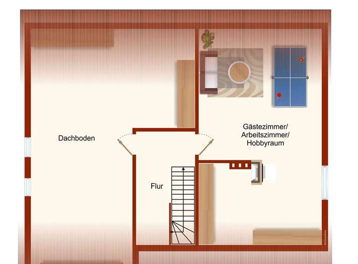 Das Dachgeschoss bietet mit einem ausgebauten Zimmer zusätzlichen Raum – perfekt als Rückzugsort für Kinder, Gäste oder als kreatives Arbeitszimmer. Auf der gegenüberliegenden Seite befindet sich ein weiterer Dachbodenraum, der wertvollen Stauraum für Spielsachen, saisonale Kleidung oder andere Familienutensilien bietet.