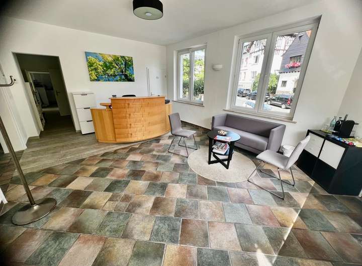 Im Erdgeschoss befindet sich eine etwa 101 m² große Praxis mit fünf Kfz-Stellplätzen zur Limburger Straße hin.