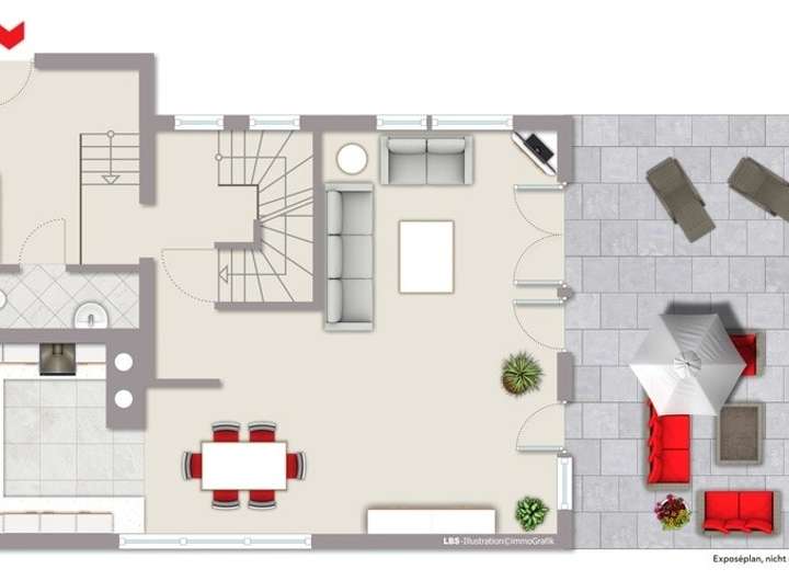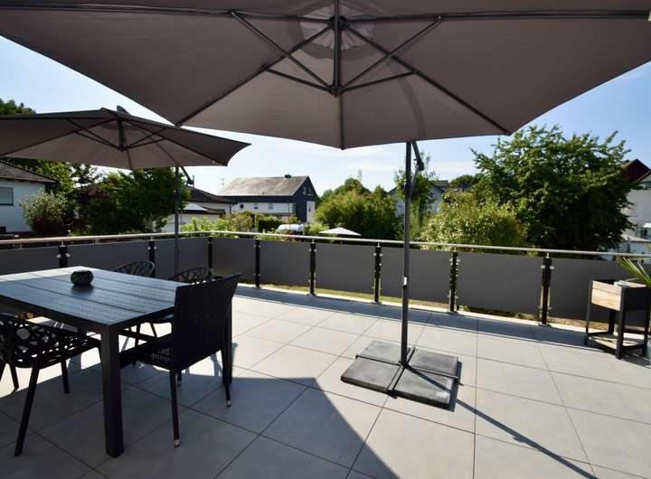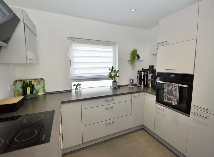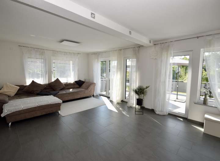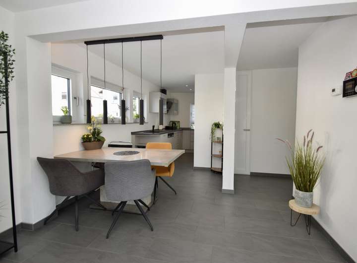 Das Erdgeschoss bietet den Eingangsbereich mit Garderobe und Gäste-WC. Über eine kleine Treppe gelangen Sie in den Wohnbereich mit offener Wohnküche und großen Wohn-/ Esszimmer mit bodentiefen Fenstern zur Terrasse. Die Südterrasse mit über 30m² Fläche wurde erst in 2024 fertig gestellt.
