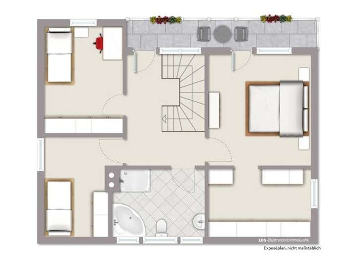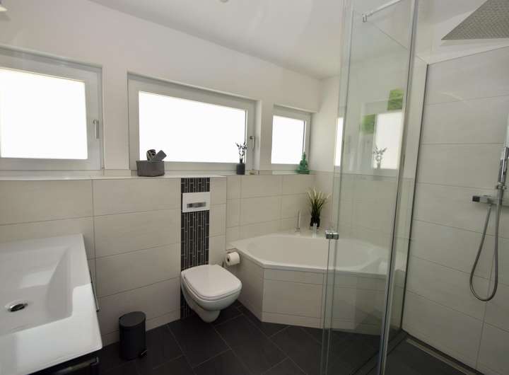 Im Obergeschoss befinden sich das Elternschlafzimmer mit Ankleide, zwei Kinderzimmer, der Balkon und das moderne Badezimmer mit bodengleicher Dusche und Wanne.
