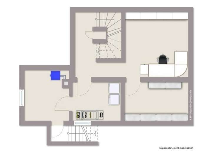 Im Untergeschoss befinden sich die Waschküche, Abstellmöglichkeiten und der Heizungsraum mit Außenaufgang in den Garten. Ein Raum im Untergeschoss ist als Büro und Hobby-Raum ausgebaut.