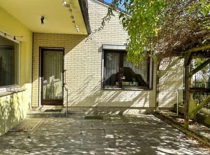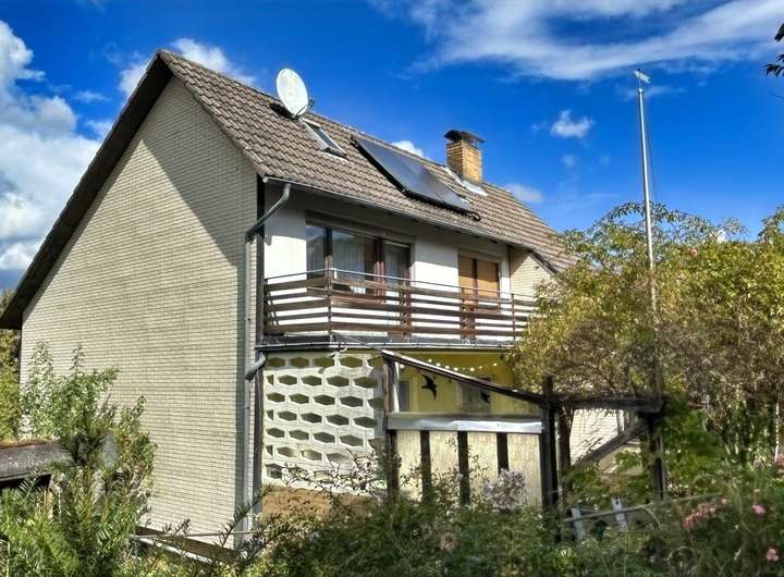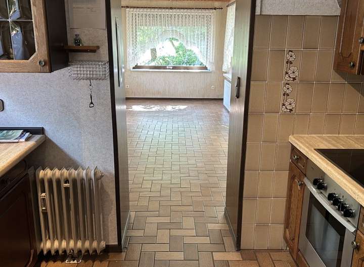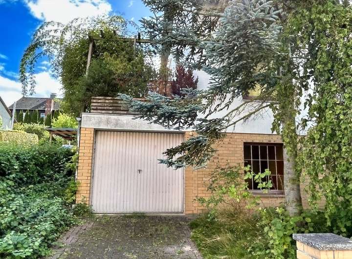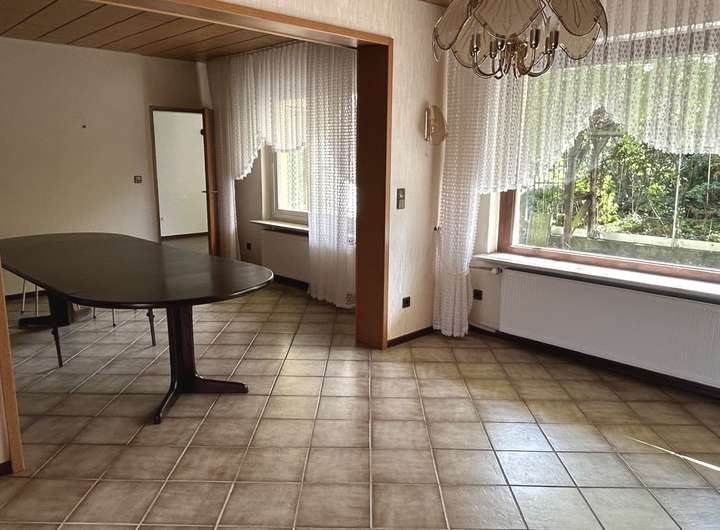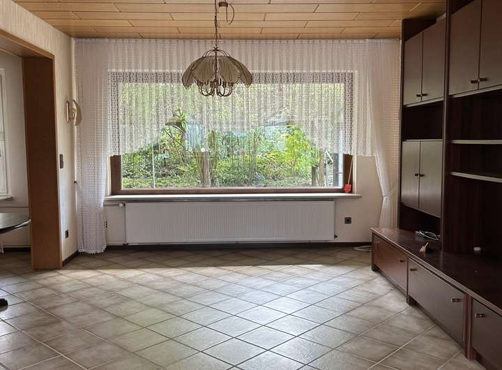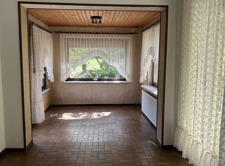 Durch die Hanglage des Grundstücks betreten Sie das Wohnhaus im Unter- bzw. Kellergeschoss, das u. a. eine Einzelgarage, ein Arbeits- / Gästezimmer sowie klassische Kellerräume (wie Wasch- und Heizungskeller) beherbergt. Aus dem Vollkeller können Sie eine weitere (angebaute) Einzelgarage betreten. Ins Erdgeschoss (mit ca. 84 m²) gelangen Sie über eine offene Treppenanlage. Hier finden Sie das geräumige Wohnzimmer mit rund 43 m², ein helles Duschbad, die Küche mit Speisekammer und angrenzendem Essbereich. An das Wohn- und Esszimmer grenzt die großzügige und sichtgeschützte Südterrasse.
