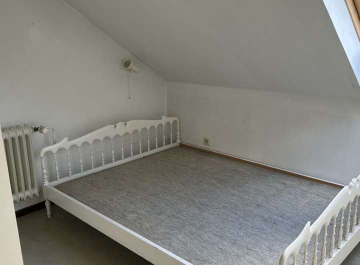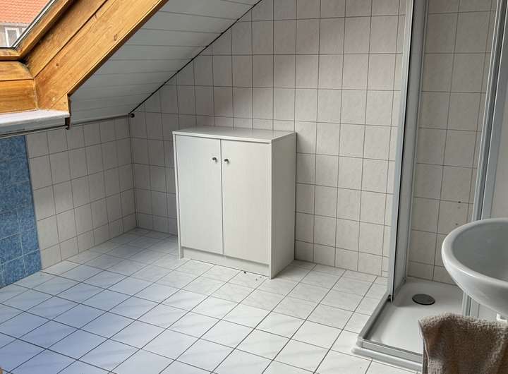 Durch das "einhüftige" (asymetrische) Satteldach bietet das Dachgeschoss (ca. 63 m²) zur Südseite teils volle Raumhöhe und einen großzügigen Südbalkon. Außerdem noch ein Duschbad, vier Schlafräume und eine Küche.