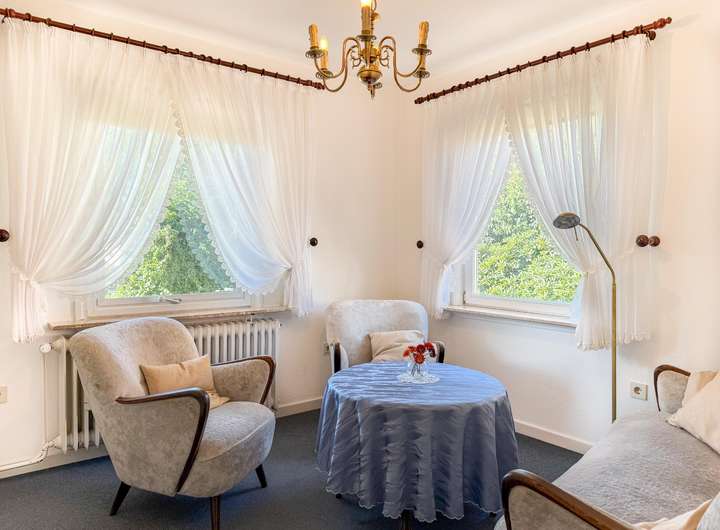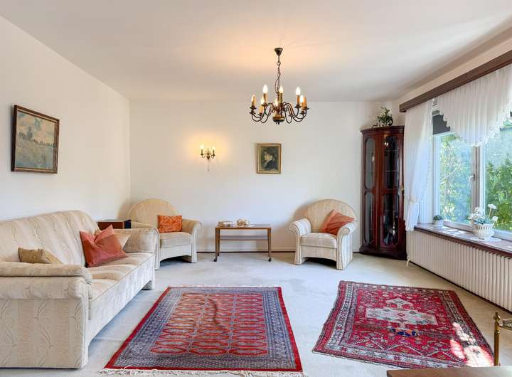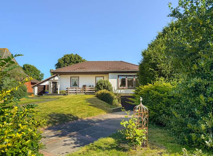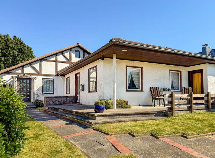 Dieses sogenannte „Hummelhaus“ mit ca. 122 m² überzeugt mit einem vielseitigen Raumangebot und komfortablen Wohnen auf einer Ebene. Mit insgesamt sechs Zimmern bietet das Haus vielfältige Nutzungsmöglichkeiten. Der Eingangsbereich empfängt Sie mit einem geräumigen Flur, der Zugang zu sämtlichen Räumen gewährt. Zur linken und rechten Seite befinden sich zwei flexibel nutzbare Zimmer. Im weiteren Verlauf gelangt man in das helle und große Wohnzimmer mit Kamin, welches eine gemütliche Atmosphäre verschafft. Angrenzend befindet sich ein Schlafzimmer, welches in direkter Nähe des Wannenbads liegt. Die Küche ist mit dem lichtdurchfluteten Esszimmer verbunden. Von dort bietet eine große Fensterfront einen wunderschönen Blick in den Garten. Von hier aus führt ein weiterer Flur mit kleiner Kochgelegenheit in ein ebenerdiges Duschbad sowie in ein zusätzliches Zimmer mit separaten Eingang. Ein Bereich, der sich hervorragend als Gäste oder auch als Einliegerbereich eignet. Die Beheizung des Hauses erfolgt über eine Wärmenetz-Biogasanlage aus dem Jahre 2014. Das Grundstück umfasst ca. 921 m² und ist vielseitig nutzbar. Neben einem Keller mit integrierter Tiefgarage stehen ein Dachboden sowie ein angrenzender Lagerraum zur Verfügung. Vor dem Haus lädt eine überdachte Terrasse mit Blick in den Vorgarten zum Verweilen ein, während man vom Garten aus einen weiten Blick ins Grüne genießt. Das Gebäude liegt angenehm zurückversetzt von der Straße. Weitere Pkw-Stellplätze sind vor dem Haus vorhanden. Vereinbaren Sie gerne einen Besichtigungstermin, um sich persönlich von den Vorzügen dieser Immobilie zu überzeugen.