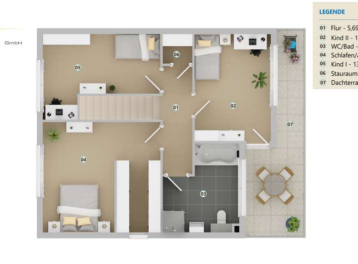 - Dachterrasse: 16,28,m² (hälftig angerechnet: 8,14 m² Wohnfläche)