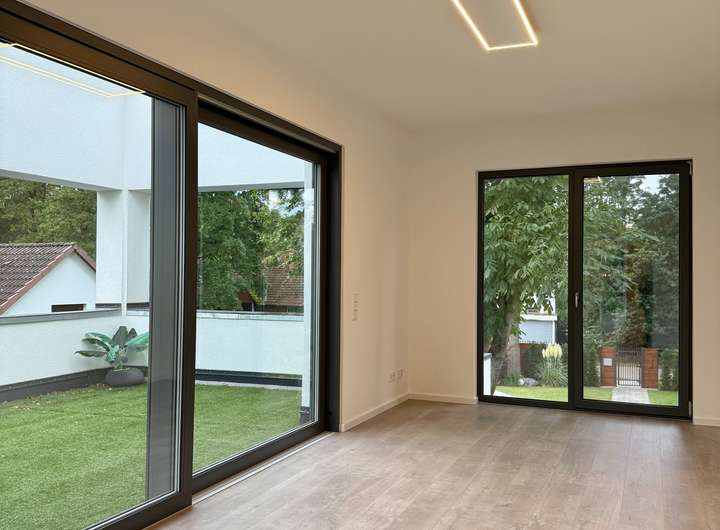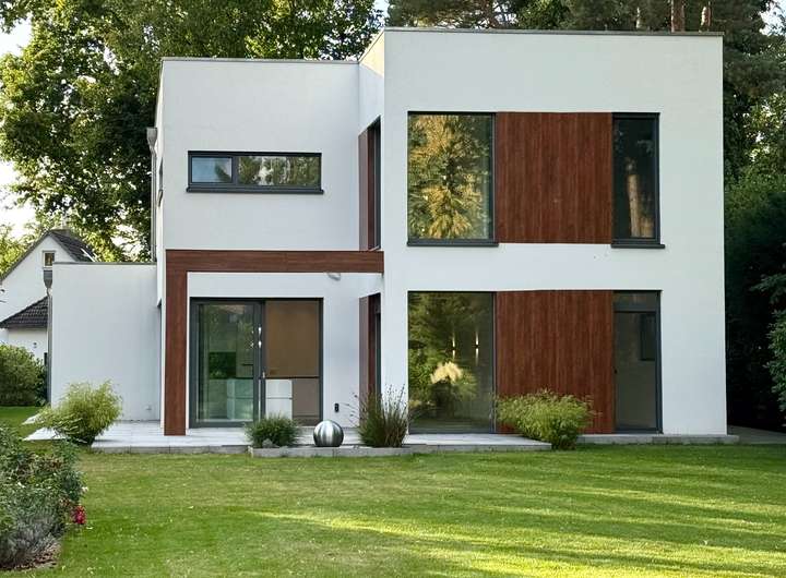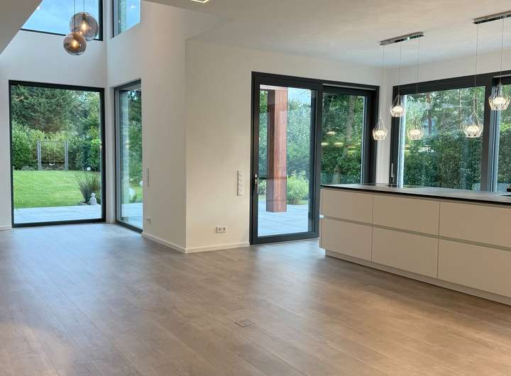 Inmitten einer herrlich grünen und ruhigen Umgebung der Wedemark liegt dieses beeindruckende Einfamilienhaus im modernen Bauhausstil, das 2022 erbaut wurde und sich durch klare Architektur, lichtdurchflutete Räume und hochwertige Ausstattung auszeichnet. Mit rund 290 m² Wohnfläche und einem großzügigen Grundstück von ca. 1.620 m² bietet es seinen Bewohnern ein außergewöhnliches Wohngefühl, das Design und Komfort harmonisch verbindet. Schon beim Betreten des Hauses empfängt Sie ein heller und großzügiger Eingangsbereich, der sofort den offenen und eleganten Charakter des Hauses widerspiegelt. Rechterhand befindet sich die separate Einliegerwohnung – ein in sich abgeschlossener Bereich von ca. 60 m² mit eigenem Wohn-, Ess- und Kochbereich, Schlafzimmer und modernem Bad. Ideal für Gäste, Familienangehörige oder auch als Büro- oder Praxisfläche nutzbar. Geradeaus öffnet sich der Flur zum Mittelpunkt des Hauses: dem ca. 60 m² großen Wohn- und Essbereich mit offener Designküche und einer stilvollen Kochinsel. Bodentiefe Fensterfronten geben den Blick auf den Garten frei und lassen den gesamten Raum im Tageslicht erstrahlen. Das architektonische Highlight ist die offene Galerie über zwei Etagen, die nicht nur für ein besonderes Raumgefühl sorgt, sondern auch eine direkte Sichtachse in den weitläufigen Garten bietet. Von hier gelangen Sie auf mehrere Terrassen – darunter eine gemütliche Frühstücksterrasse – die zu unterschiedlichen Tageszeiten zum Verweilen einladen. Im Erdgeschoss finden Sie zudem ein Gästezimmer oder Büro, ein Gäste-Bad mit bodentiefer Dusche sowie einen praktischen Technik- und Abstellraum. Über die moderne Treppe gelangen Sie in das Obergeschoss, das mit einer hellen Galerie und Ausblick in den Garten beeindruckt. Hier liegen zwei geräumige Kinderzimmer, die jeweils Zugang zu einer eigenen Terrasse haben – perfekt für Rückzugsmöglichkeiten oder entspannte Sonnenstunden. Das großzügige Badezimmer überzeugt mit bodentiefer Dusche, Badewanne und Doppelwaschtisch. Gegenüber befindet sich das Masterbedroom mit separater Ankleidebereich und einem traumhaften Blick ins Grüne. Auch im Außenbereich setzt sich das luxuriöse Wohnkonzept fort: Ein liebevoll angelegter Garten, mehrere Terrassen, eine großzügige Einfahrt mit elektrischem Tor und eine beheizbare Doppelgarage runden das Anwesen ab. Hier genießen Sie Privatsphäre, Sicherheit und höchsten Wohnkomfort – ein Zuhause für Menschen, die das Besondere suchen.