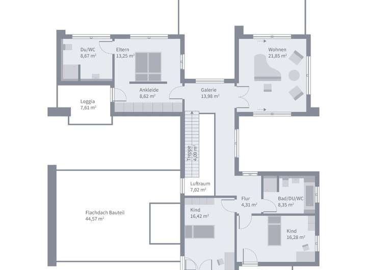 Im Obergeschoss begeistert das Haus unter anderem mit einer großzügigen Eltern-Suite mit angeschlossenem Dusch-WC, Ankleide und Loggia, auf der die ersten Sonnenstrahlen des Tages genossen werden können. Ebenso finden hier zwei Kinderzimmer mit eigenem Bad und Balkon sowie eine Galerie ihren Platz. Ein weiterer Wohnraum kann zudem flexibel für die eigenen Hobbys, als zusätzliches Kinderzimmer oder zur Beherbergung von Gästen genutzt werden.