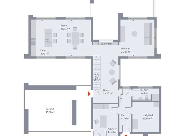 Dieser Architektenentwurf ist ein Planungsvorschlag und dient der Inspiration und Orientierung. Grundrisse, Architektur-Extras, Ausbau- und Effizienzhaus-Stufen werden individuell an Ihre Wünsche und Bedürfnisse angepasst.