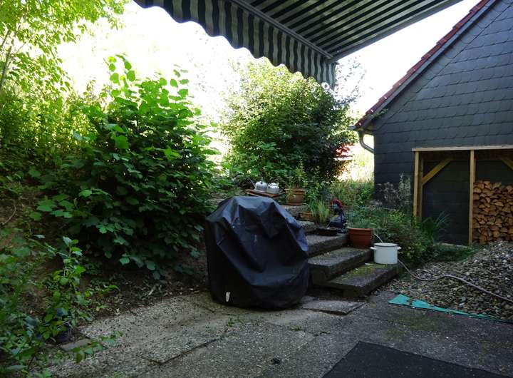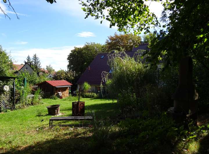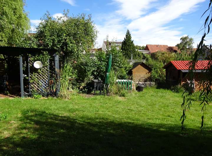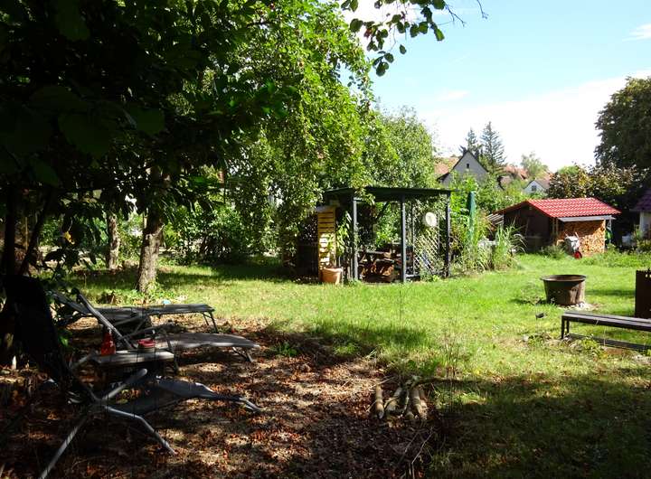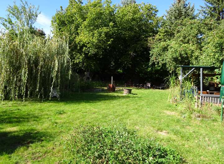 Den großen idyllischen Garten erreichen Sie entweder über die Terrasse vom Esszimmer des Haupthauses abgehend oder indem Sie rechts am Haus entlang gehen, wo sich auch der zweite Eingang befindet. Es gibt einige Obstbäume, einen kleinen Teich, Grillplatz für gemütliche Abende mit Freunden und Familie, eine Pergola mit Sitzgruppe, ein kleines Gartenhäuschen, Beete und ein Hochbeet. Der Garten ist teilweise durch alten Baum- und Heckenbestand schön bewachsen und uneinsichtig.