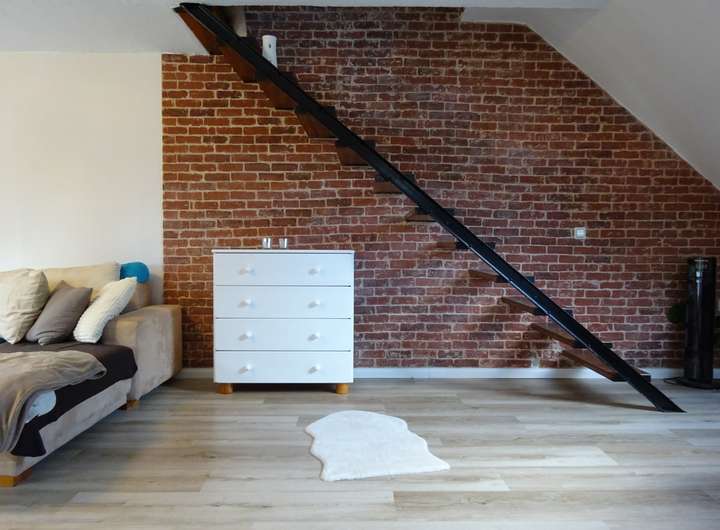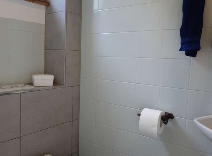 Über eine Steintreppe gelangen Sie in das Obergeschoss, wo sich neben dem Duschbad mit WC und Fenster das große Wohnzimmer mit anschließender Küche befindet.