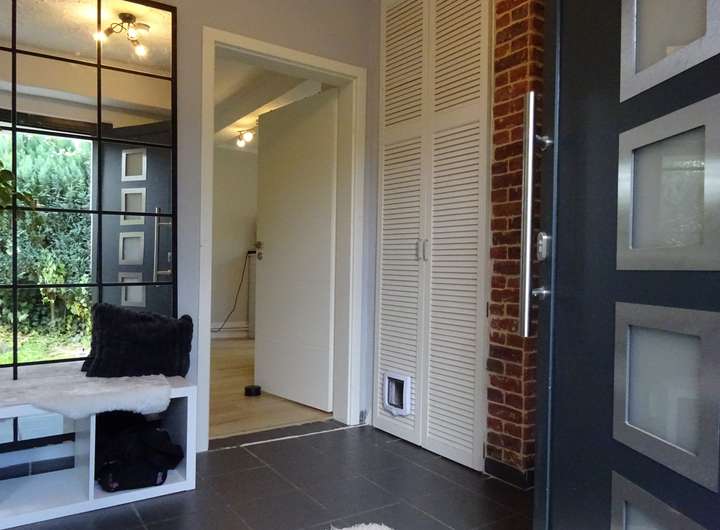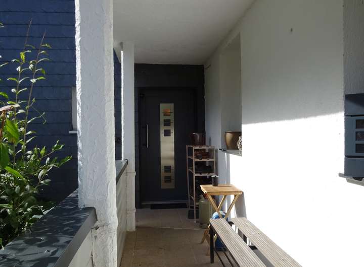 Die zweite Wohneinheit betreten Sie durch die seitlich am Haus befindliche Eingangstür. Hier sind im Erdgeschoss das Schlafzimmer und das Büro / Garderobenbereich gelegen.