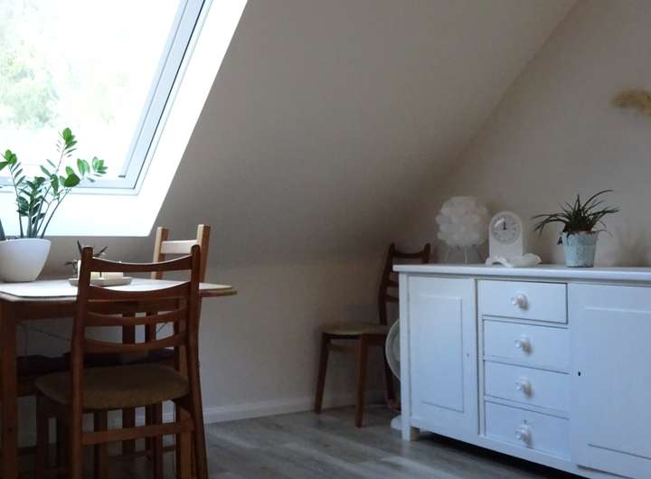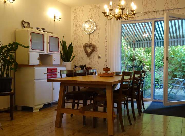 Sie finden im Haupthaus einen Wohnbereich mit Kamin, ein Gäste-WC, die Küche mit Durchreiche und das vom Wohnzimmer offen zugängliche Esszimmer im Erdgeschoss.