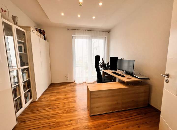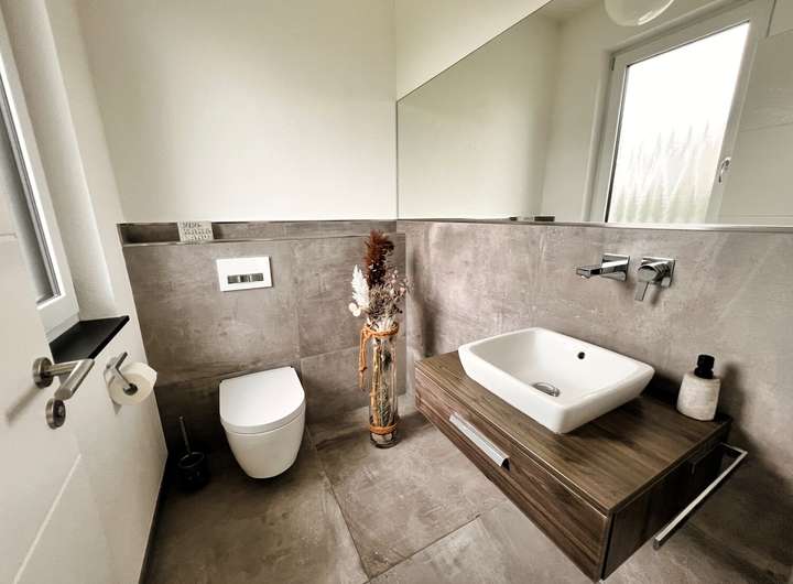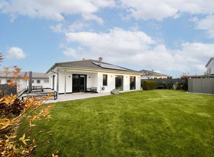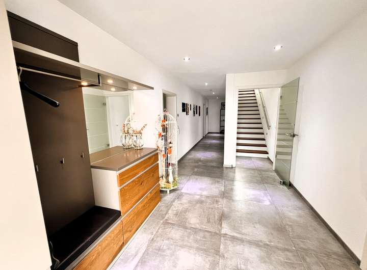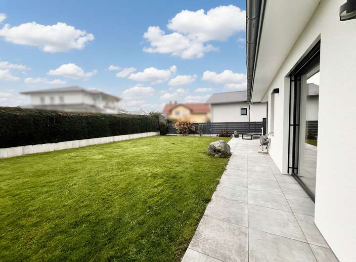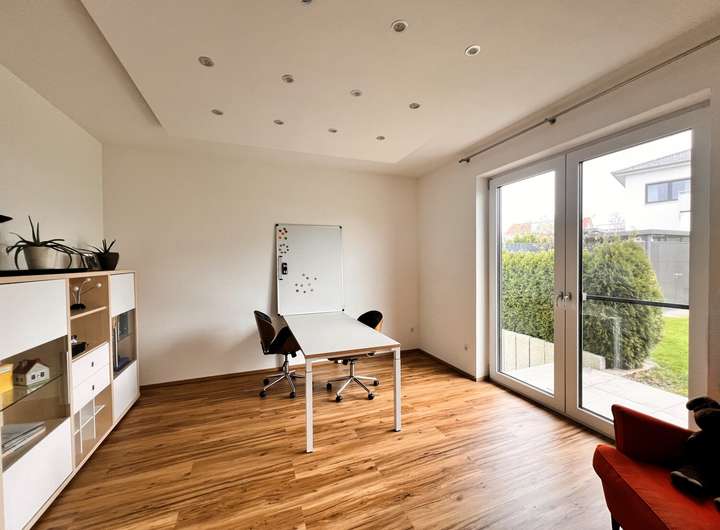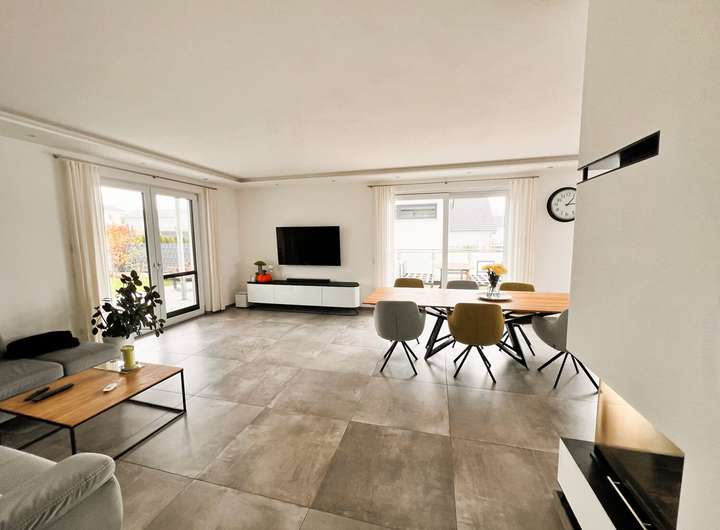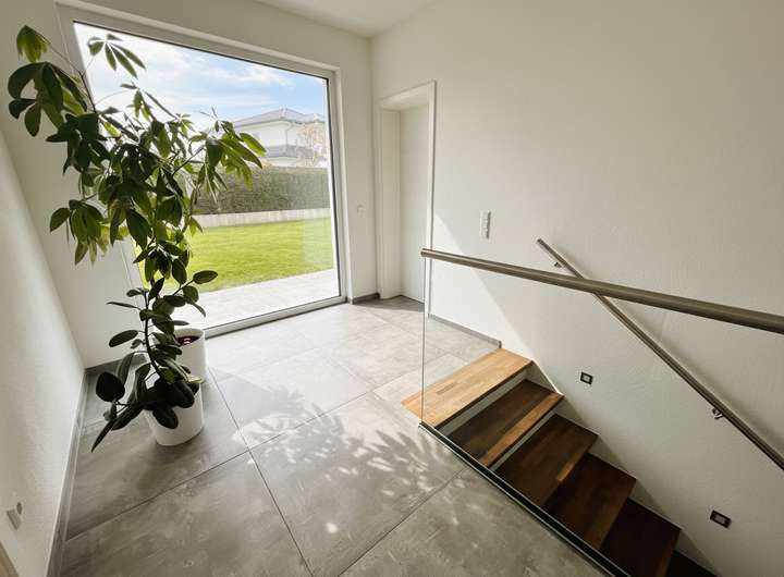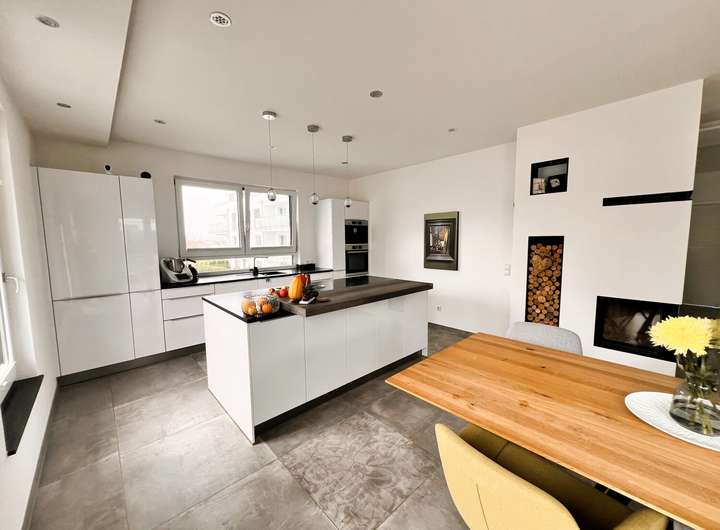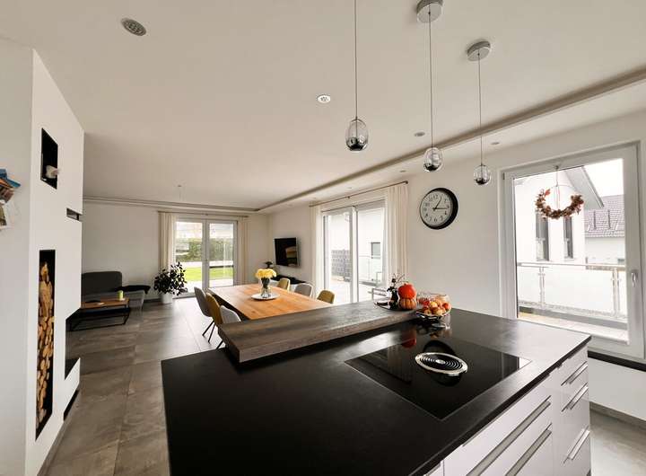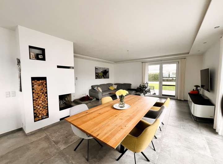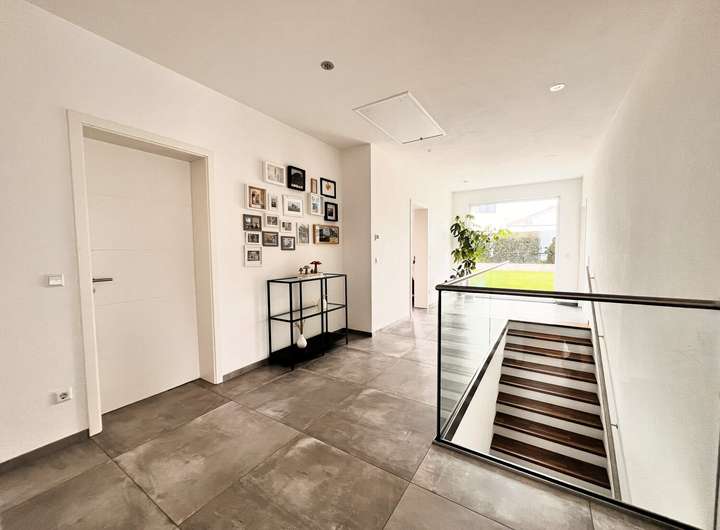 Edle Bodenbeläge, große Fensterfronten und innovative Haustechnik sorgen für hohen Wohnkomfort. Die Photovoltaikanlage (2021, 9,66 kWp) trägt zu niedrigen Energiekosten bei. Eine Doppelgarage sowie Außenstellplätze runden das Angebot ab.
