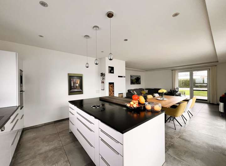 Das Herzstück bildet der großzügige Wohn- und Essbereich mit offener, hochwertig ausgestatteter Küche und Kaminofen. Von hier gelangen Sie in den gepflegten Garten mit großen Terrassen. Auf dieser Ebene befinden sich außerdem weitere Schlafzimmer, ein luxuriöses Bad und ein Ankleidezimmer am Elternschlafzimmer.