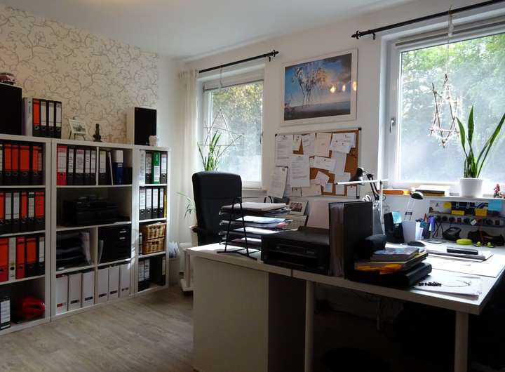 Die zweite Wohneinheit betreten Sie durch die seitlich am Haus befindliche Eingangstür. Hier sind im Erdgeschoss das Schlafzimmer und das Büro / Garderobenbereich gelegen.