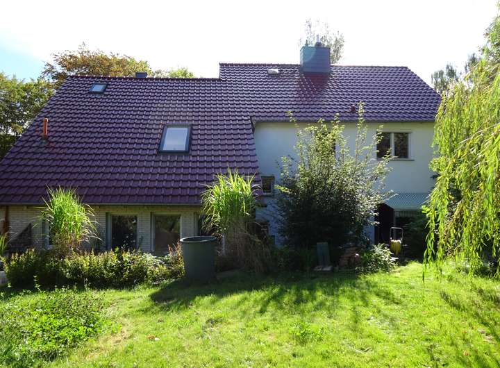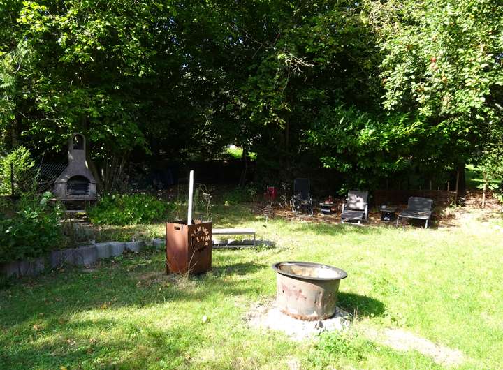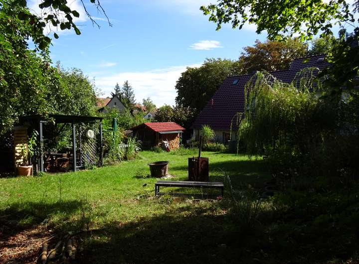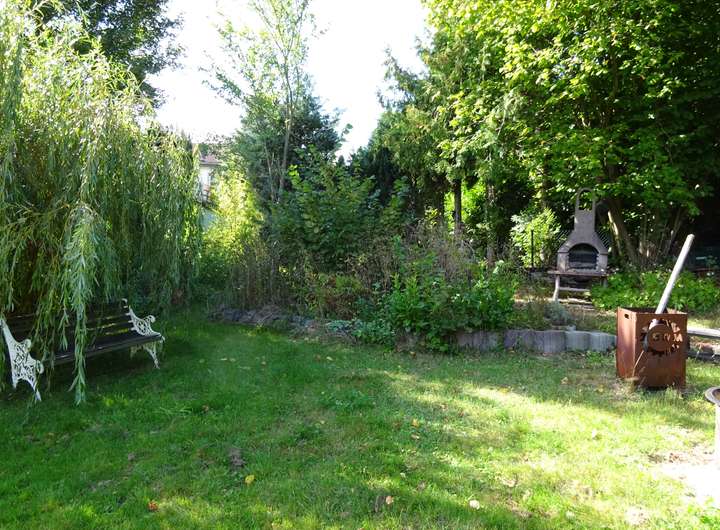 Den großen idyllischen Garten erreichen Sie entweder über die Terrasse vom Esszimmer des Haupthauses abgehend oder indem Sie rechts am Haus entlang gehen, wo sich auch der zwete Eingang befindet. Es gibt einige Obstbäume, einen kleinen Teich, Grillplatz für gemütliche Abende mit Freunden und Familie, eine Pergola mit Sitzgruppe, ein kleines Gartenhäuschen, Beete und ein Hochbeet. Der Garten ist teilweise durch alten Baum- und Heckenbestand schön bewachsen und uneinsichtig.