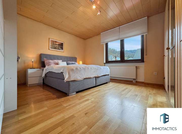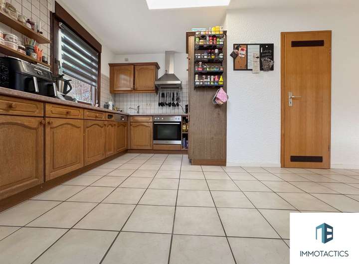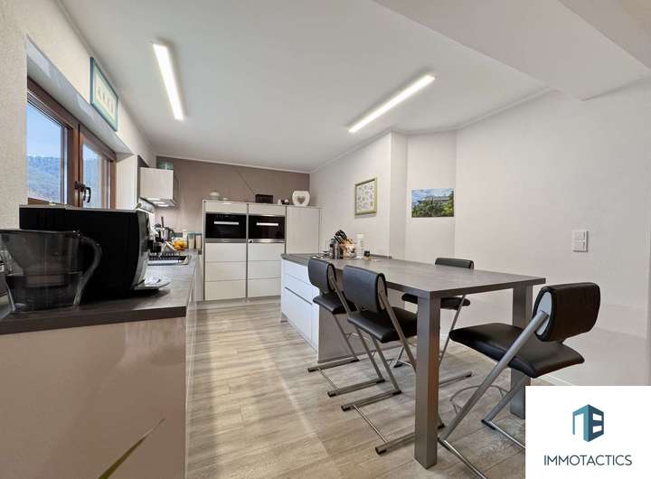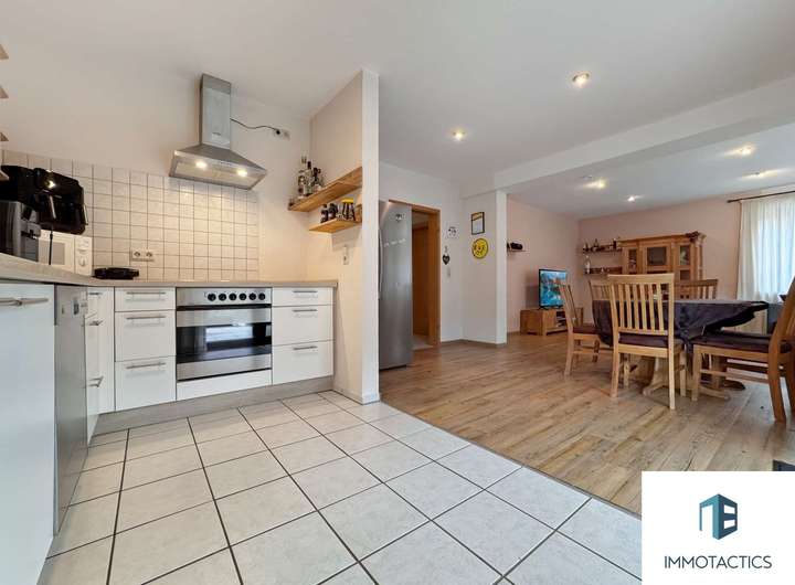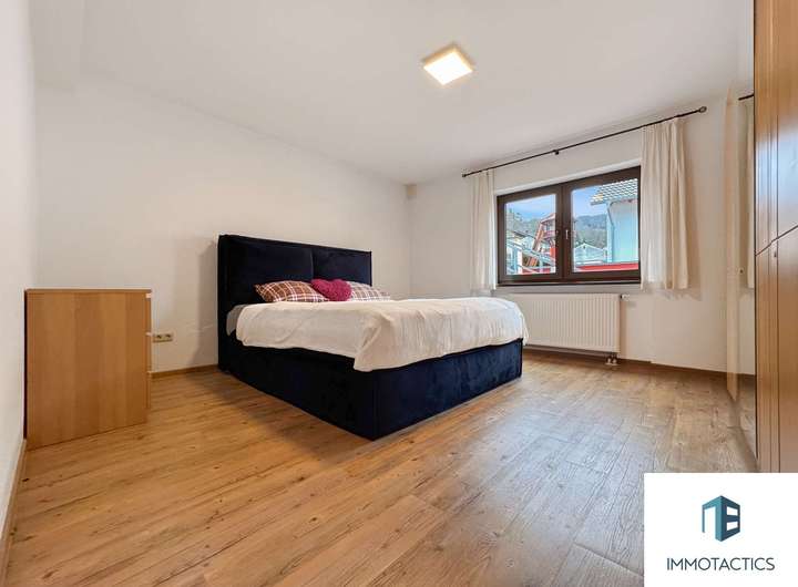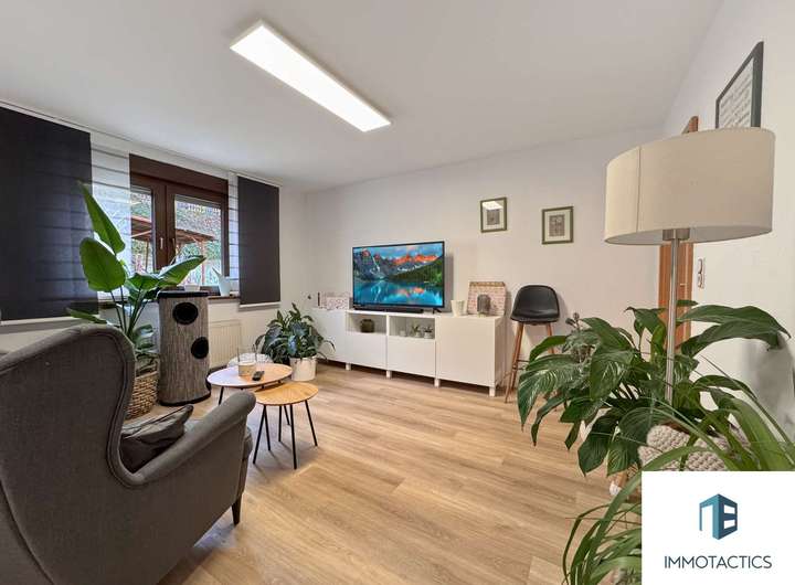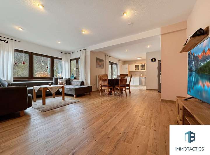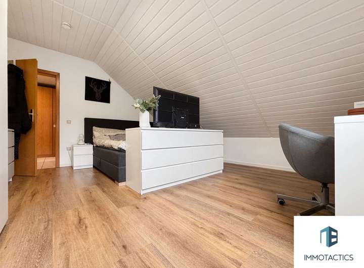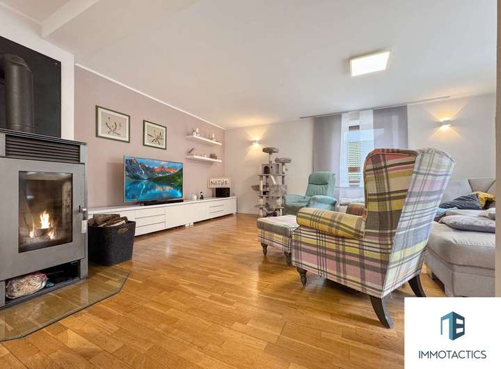 Das Herzstück des Hauses bildet die geräumige Wohneinheit im Obergeschoss. Auf rund 155 m² erwarten Sie vier vielseitig nutzbare Zimmer, zwei Bäder sowie ein offener Wohn- und Essbereich mit moderner Einbauküche. Ein Kamin sorgt für gemütliche Abende, während der angrenzende Balkon zusätzlichen Freiraum bietet.
