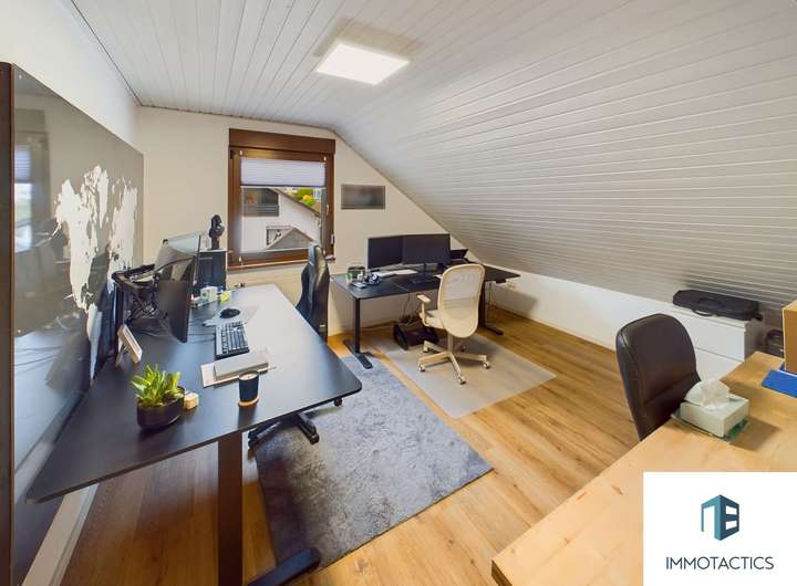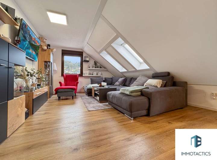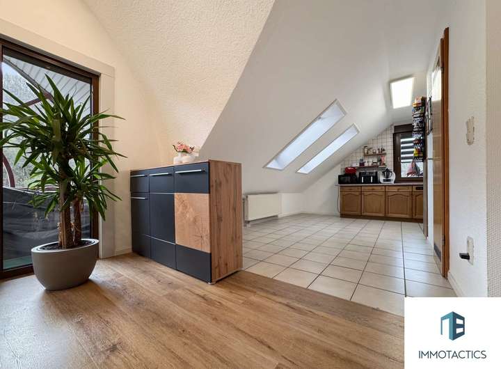 Die charmante Dachgeschosswohnung bietet ca. 103 m² Wohnfläche und überzeugt mit einem offenen Wohn- und Essbereich samt moderner Einbauküche, einem Schlafzimmer, einem zusätzlichen Büro sowie einem Tageslichtbad mit Duschwanne.