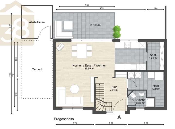 Zusätzliche Pluspunkte sind das Carport und der praktische Abstellraum.