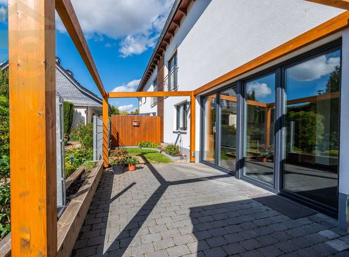 Die gepflegte Terrasse lädt zu entspannten Stunden im Freien ein. Die komfortable Ausstattung und der moderne Standard dieser Doppelhaushälfte werden Sie begeistern.