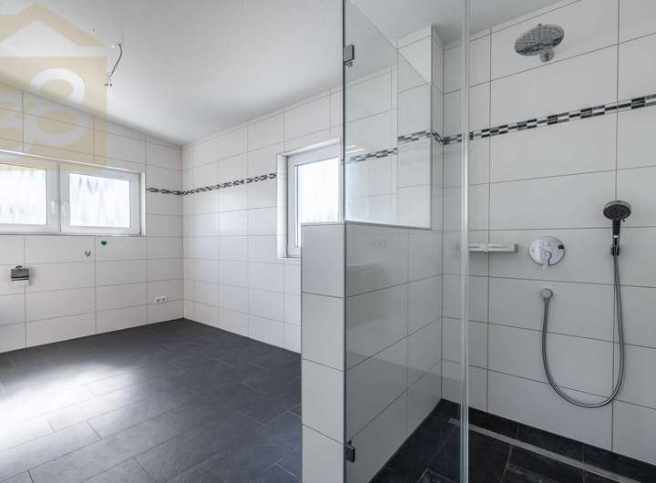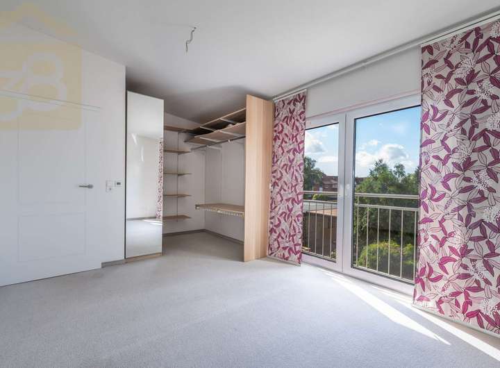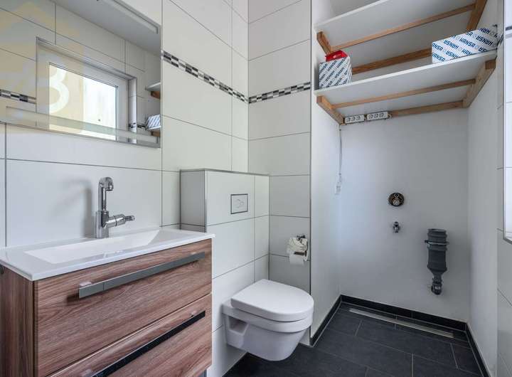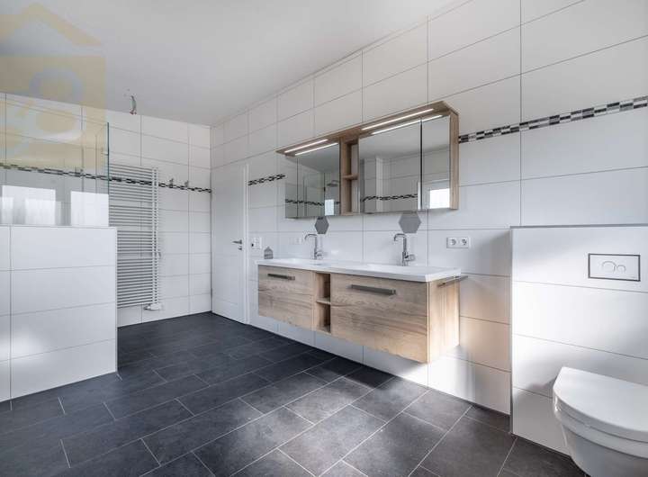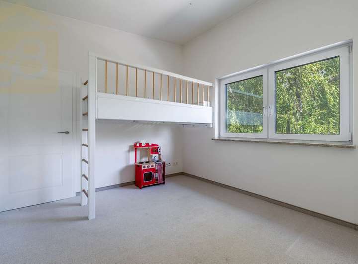 Im Obergeschoss befindet sich ein Elternschlafzimmer mit Ankleide, zwei Kinderzimmer und ein großzügiges Badezimmer mit ebenerdiger Dusche, in dem auch noch eine Badewanne Platz hätte.