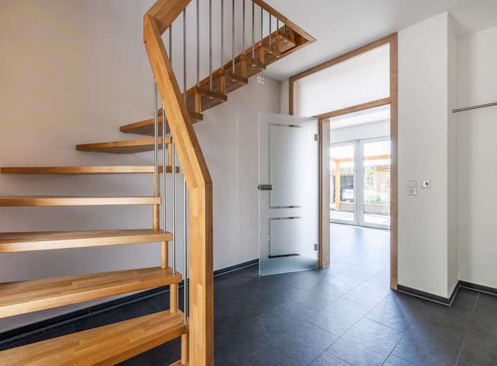 Im Erdgeschoss erwarten Sie ein heller und freundlicher Wohn-Essbereich, der durch bodentiefe Fenster eine wunderbare Verbindung zum Garten schafft. Die offene Einbauküche ist geschmackvoll eingerichtet und lässt keine Wünsche offen. Der angrenzende Abstellraum bietet genug Platz für Vorräte. Des Weiteren befinden sich im Erdgeschoss ein Duschbad mit gehobener Ausstattung. Der Hauswirtschaftsraum mit eingebauter Küchenzeile sorgt für zusätzlichen Stauraum.