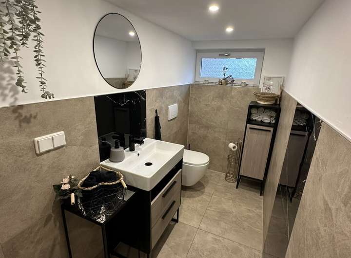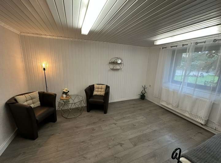 Im Erdgeschoss erwartet Sie ein freundliches Wohnzimmer mit Zugang zur Terrasse, von der aus Sie einen schönen Blick in den Garten und auf die angrenzende Pferdekoppel genießen können. Die funktionale Küche mit Einbauküche sowie ein modernes Bad mit Dusche ergänzen die Ebene.