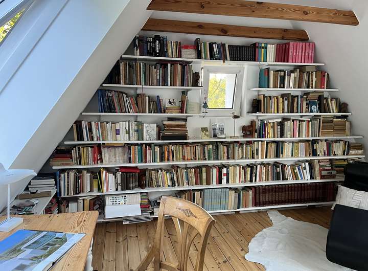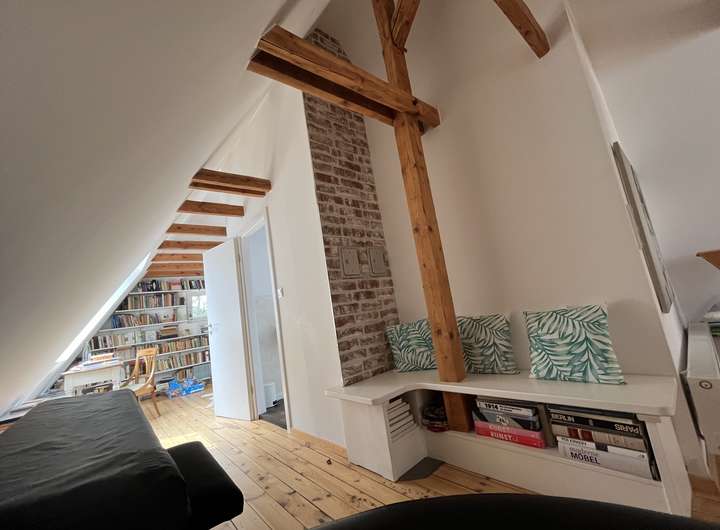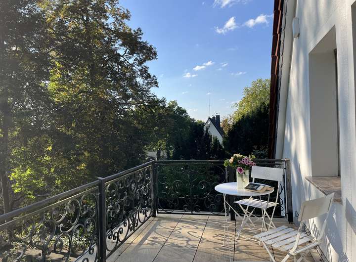 Balkon und Terrasse mit Möbeln, Stäbchenparkett und Orientteppiche im EG, Teppich im 1. OG, Holzdielen im Dachgeschoss