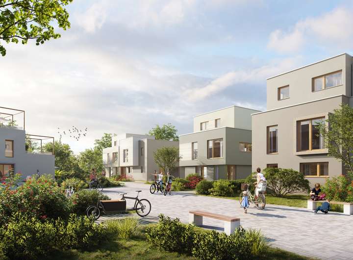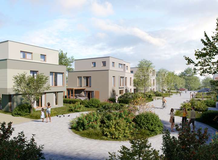 Eine verkehrsberuhigte Stichstraße erschließt die Wohneinheiten. Westlich dieser Straße entstehen vier Einfamilienhäuser und sechs Doppelhaushälften mit großzügigen Gärten. Östlich liegen fünf kleine Mehr- familienhäuser mit Tiefgarage und schön gestalteten Außenanlagen. Die verschiedenen Gebäude entstehen als Ensemble in hochwertiger Architektur und werden nach aktuellen Effizienzhaus Standards errichtet. Die Außenanlagen werden intensiv begrünt und mit heimischen Gehölzen bepflanzt.