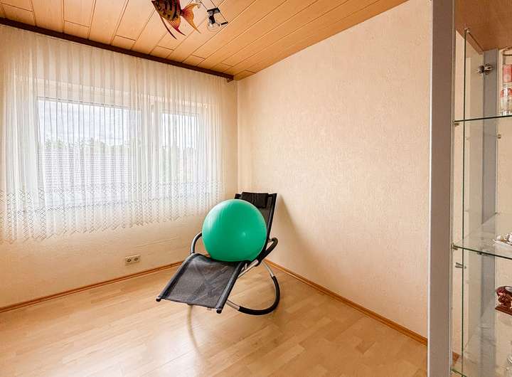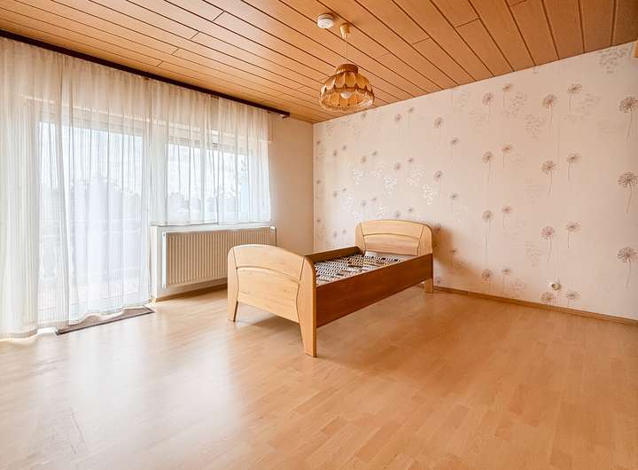 Im Erdgeschoss des Anbaus befindet sich ein weiteres großzügiges Wohnzimmer mit direktem Zugang zur zweiten Terrasse und in den Garten, ergänzt durch ein Badezimmer sowie einen Flurbereich mit Treppenaufgang ins Dachgeschoss. Dort erwarten Sie ein weiteres Schlafzimmer, ein großzügiger Flur, ein Trockenraum, ein Abstellraum sowie als besonderes Highlight eine Sauna.