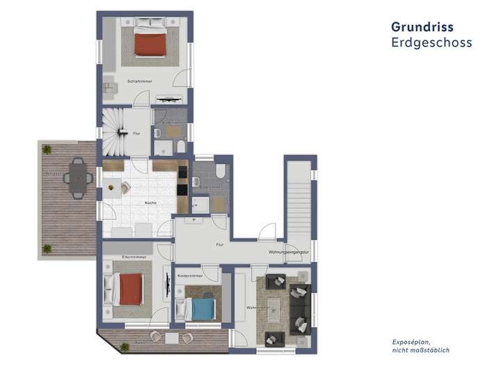 Die Erdgeschosswohnung verfügt über eine Wohnfläche von ca. 126 m². Hier erwarten Sie ein lichtdurchflutetes Wohnzimmer, ein behagliches Elternschlafzimmer, zwei flexibel nutzbare Kinder- bzw. Arbeitszimmer, eine geräumige Wohnküche, ein Badezimmer sowie eine überdachte Terrasse auf der Nordwestseite – ideal, um den Feierabend entspannt ausklingen zu lassen Der Zugang zur Terrasse erfolgt über die Wohnküche. Vom Wohn- und Elternschlafzimmer aus gelangen Sie zudem auf den sonnigen Balkon.