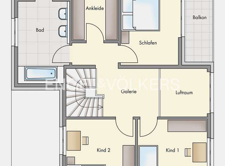 Im Erdgeschoss findet sich die offene Wohn- Essküche, die sich auf Wunsch auch als separaten Raum gestalten lässt. Modern zeigt sich auch die offene Galerie.