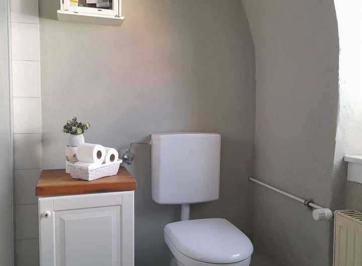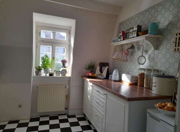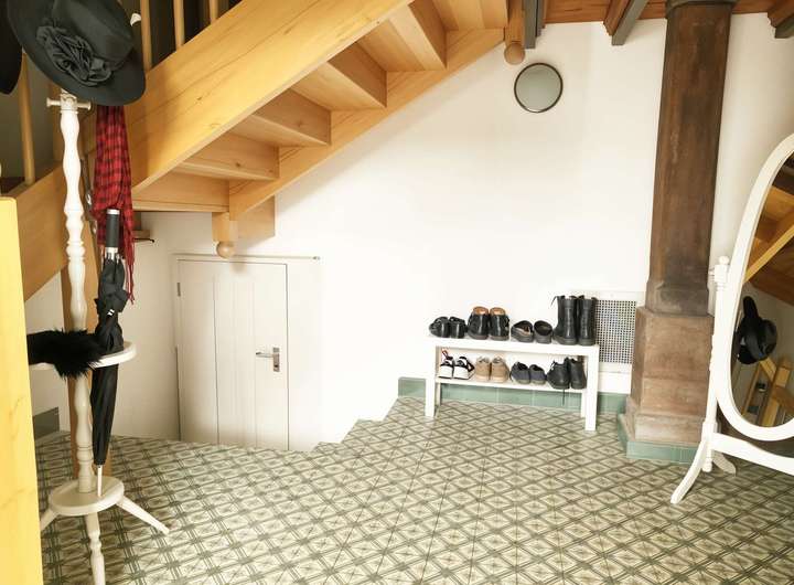 Der private Zugang auf der Rückseite führt Sie in den Wohnbereich, der ab 2020 umfassend modernisiert wurde und heutigen Wohnkomfort mit historischem Flair verbindet: